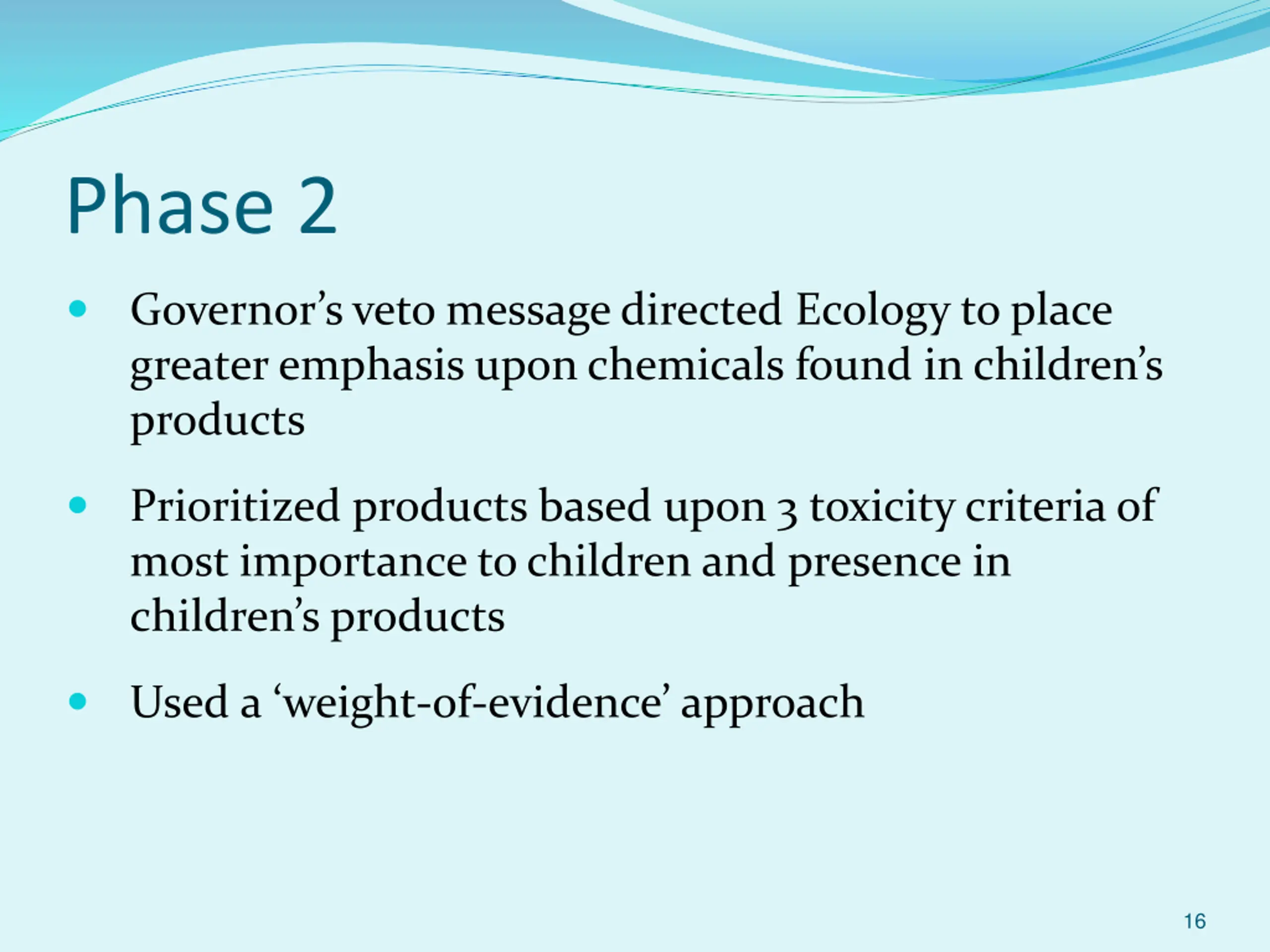 Phase 2 Governor s veto message directed Ecology to place greater emphasis upon chemicals found in children s products Prioritized products based upon 3 toxicity criteria of most importance to children and presence in children s products Used a weight-of-evidence approach 16