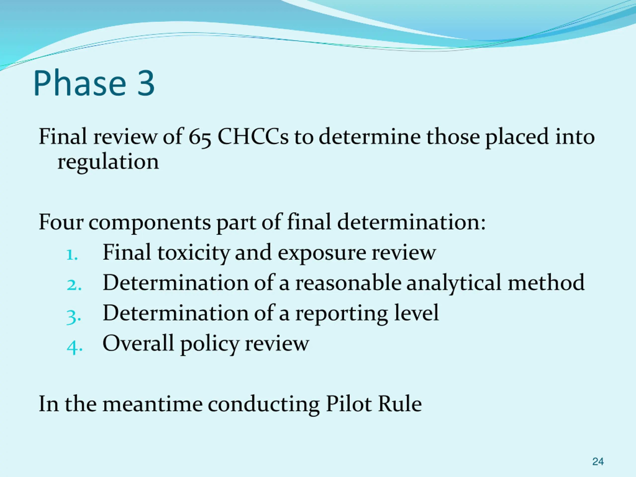 Phase 3 Final review of 65 CHCCs to determine those placed into regulation Four components part of final determination: 1. Final toxicity and exposure review 2. Determination of a reasonable analytical method 3. Determination of a reporting level 4. Overall policy review In the meantime conducting Pilot Rule 24