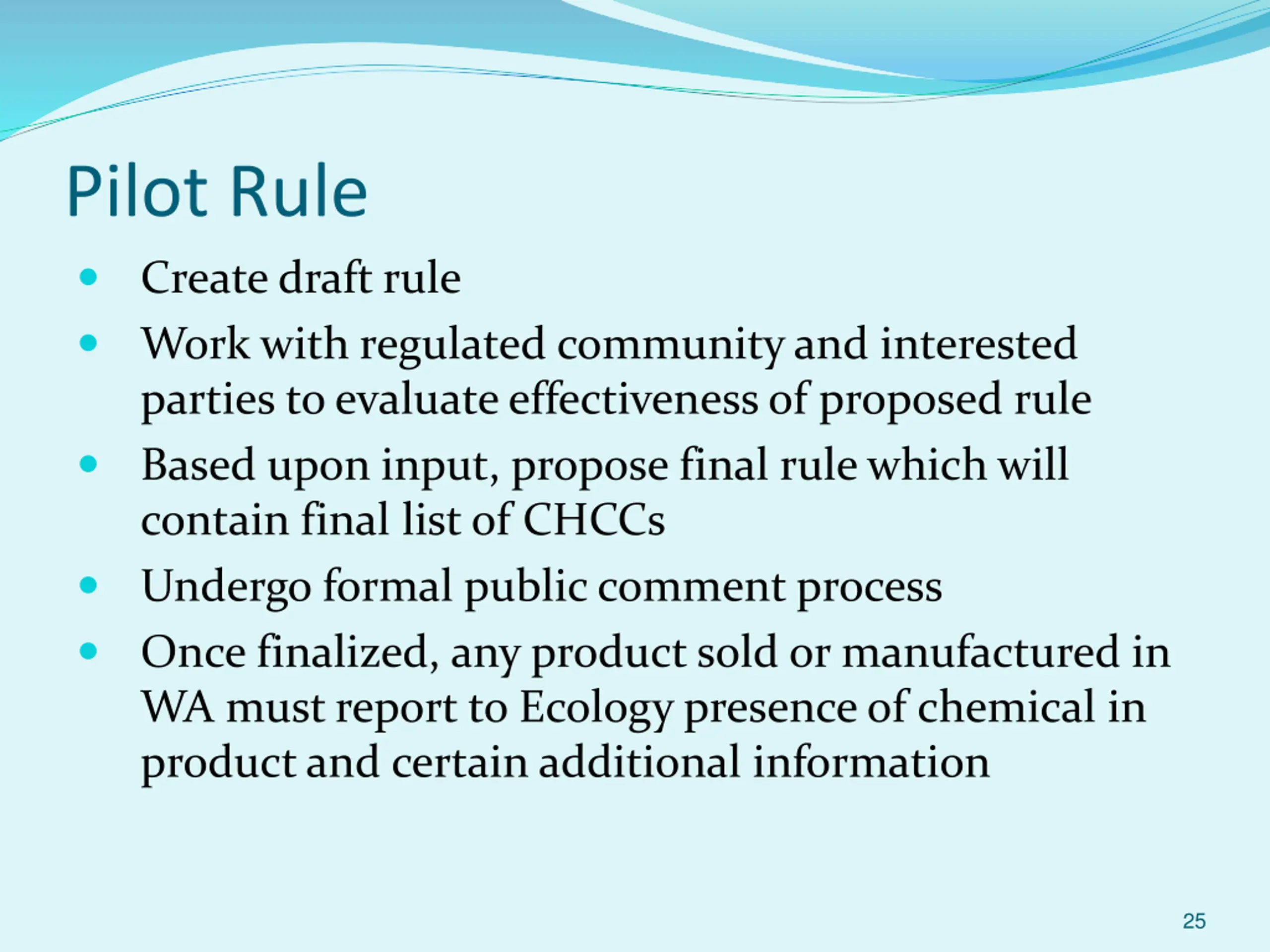 Pilot Rule Create draft rule Work with regulated community and interested parties to evaluate effectiveness of proposed rule Based upon input, propose final rule which will contain final list of CHCCs Undergo formal public comment process Once finalized, any product sold or manufactured in WA must report to Ecology presence of chemical in product and certain additional information 25