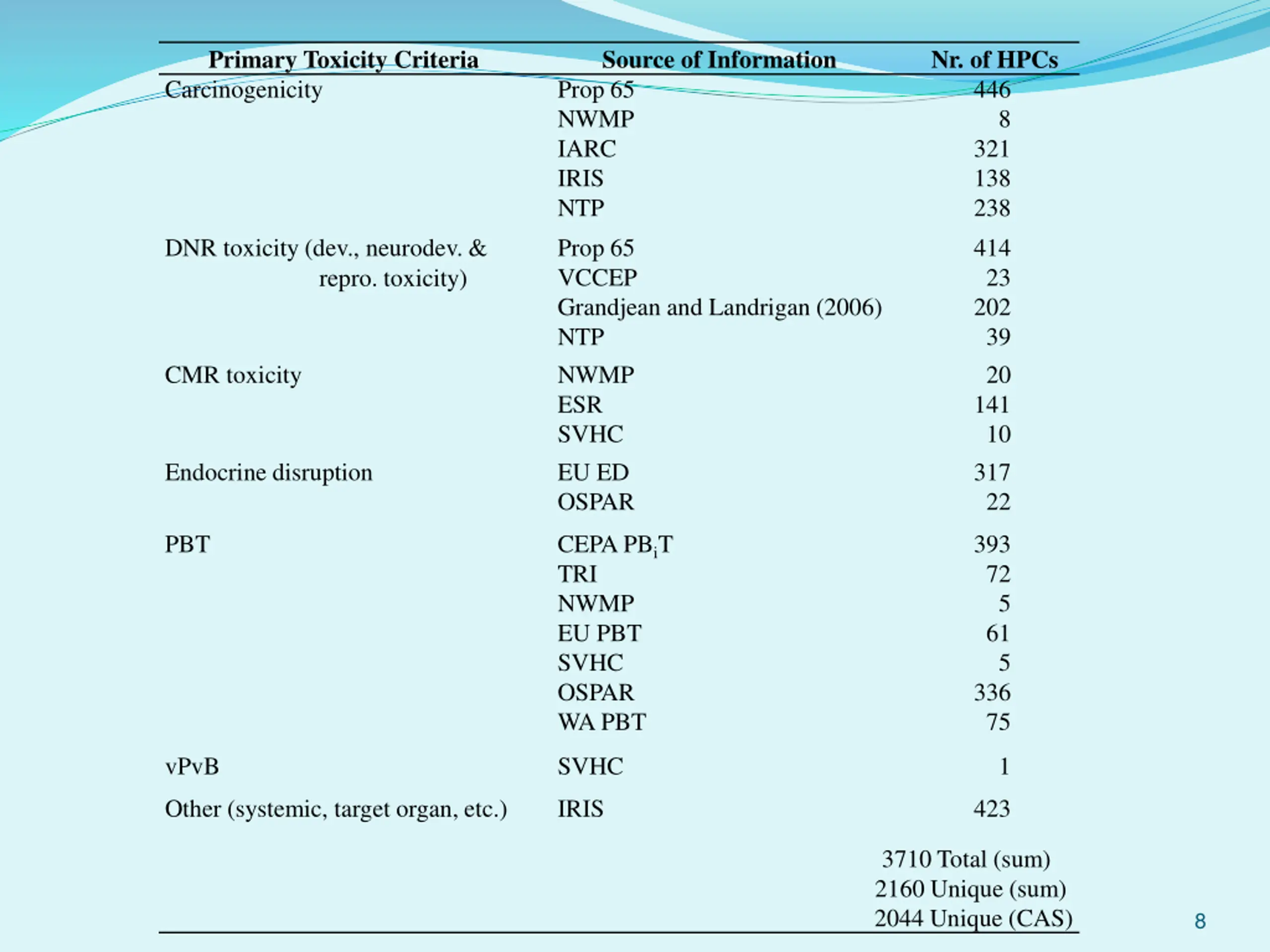 Primary Toxicity Criteria Carcinogenicity Source of Information Prop 65 NWMP IARC IRIS NTP Prop 65 VCCEP Grandjean and Landrigan (2006) NTP NWMP ESR SVHC EU ED OSPAR Nr. of HPCs 446 8 321 138 238 414 23 202 39 20 141 10 317 22 DNR toxicity (dev., neurodev. & repro. toxicity) CMR toxicity Endocrine disruption PBT CEPA PBiT TRI NWMP EU PBT SVHC OSPAR WA PBT 393 72 5 61 5 336 75 vPvB SVHC 1 Other (systemic, target organ, etc.) IRIS 423 3710 Total (sum) 2160 Unique (sum) 2044 Unique (CAS) 8