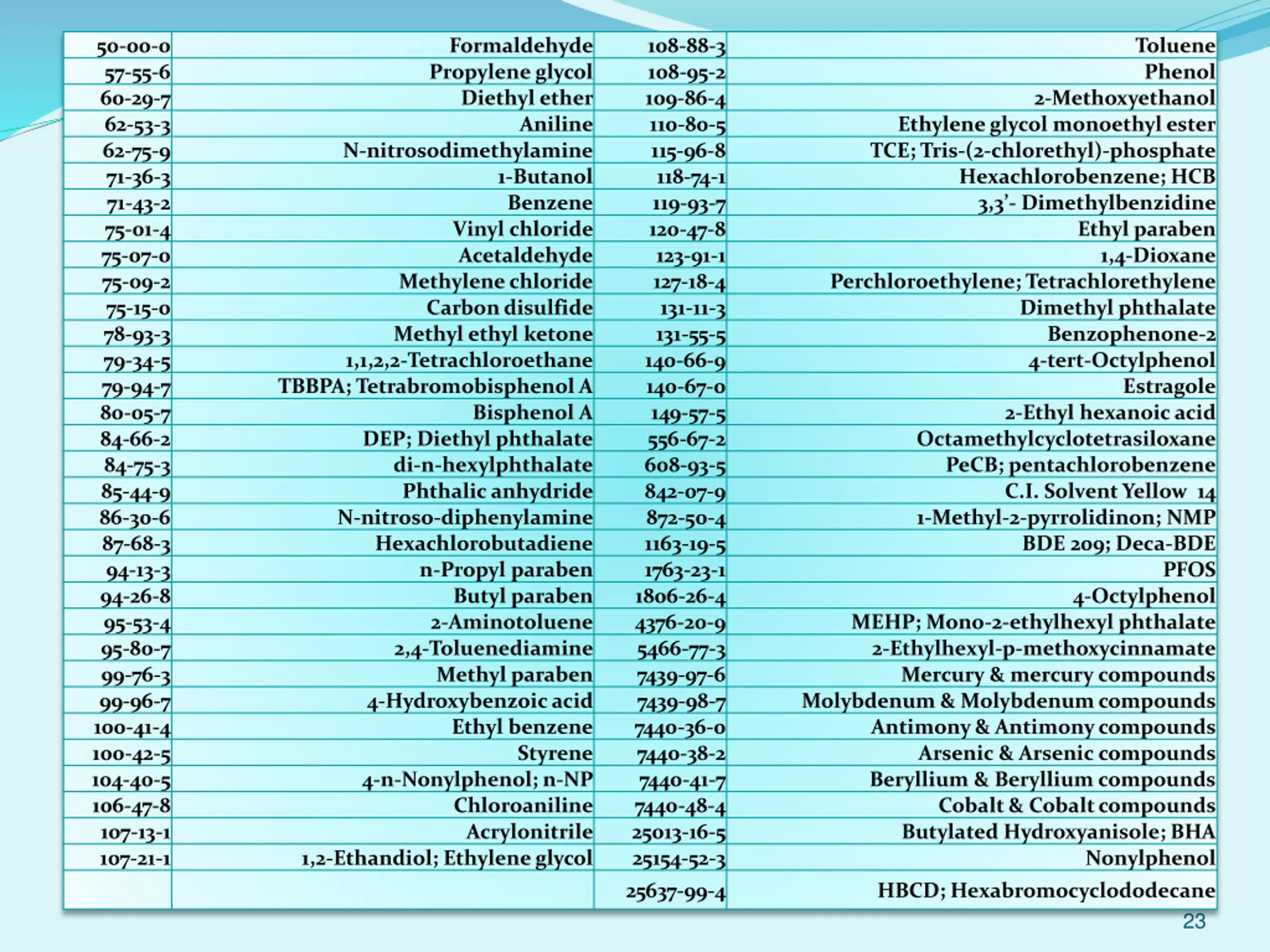50-00-0 57-55-6 60-29-7 62-53-3 62-75-9 71-36-3 71-43-2 75-01-4 75-07-0 75-09-2 75-15-0 78-93-3 79-34-5 79-94-7 80-05-7 84-66-2 84-75-3 85-44-9 86-30-6 87-68-3 94-13-3 94-26-8 95-53-4 95-80-7 99-76-3 99-96-7 100-41-4 100-42-5 104-40-5 106-47-8 107-13-1 107-21-1 Formaldehyde Propylene glycol Diethyl ether 108-88-3 108-95-2 109-86-4 110-80-5 115-96-8 118-74-1 119-93-7 120-47-8 123-91-1 127-18-4 131-11-3 131-55-5 140-66-9 140-67-0 149-57-5 556-67-2 608-93-5 842-07-9 872-50-4 1163-19-5 1763-23-1 1806-26-4 4376-20-9 5466-77-3 7439-97-6 7439-98-7 7440-36-0 7440-38-2 7440-41-7 7440-48-4 25013-16-5 25154-52-3 Toluene Phenol 2-Methoxyethanol Aniline Ethylene glycol monoethyl ester TCE; Tris-(2-chlorethyl)-phosphate Hexachlorobenzene; HCB 3,3 - Dimethylbenzidine N-nitrosodimethylamine 1-Butanol Benzene Vinyl chloride Acetaldehyde Methylene chloride Carbon disulfide Methyl ethyl ketone 1,1,2,2-Tetrachloroethane TBBPA; Tetrabromobisphenol A Ethyl paraben 1,4-Dioxane Perchloroethylene; Tetrachlorethylene Dimethyl phthalate Benzophenone-2 4-tert-Octylphenol Estragole Bisphenol A 2-Ethyl hexanoic acid Octamethylcyclotetrasiloxane PeCB; pentachlorobenzene C.I. Solvent Yellow 14 1-Methyl-2-pyrrolidinon; NMP BDE 209; Deca-BDE DEP; Diethyl phthalate di-n-hexylphthalate Phthalic anhydride N-nitroso-diphenylamine Hexachlorobutadiene n-Propyl paraben Butyl paraben 2-Aminotoluene 2,4-Toluenediamine Methyl paraben 4-Hydroxybenzoic acid Ethyl benzene PFOS 4-Octylphenol MEHP; Mono-2-ethylhexyl phthalate 2-Ethylhexyl-p-methoxycinnamate Mercury & mercury compounds Molybdenum & Molybdenum compounds Antimony & Antimony compounds Arsenic & Arsenic compounds Beryllium & Beryllium compounds Cobalt & Cobalt compounds Butylated Hydroxyanisole; BHA Styrene 4-n-Nonylphenol; n-NP Chloroaniline Acrylonitrile 1,2-Ethandiol; Ethylene glycol Nonylphenol 25637-99-4 HBCD; Hexabromocyclododecane 23