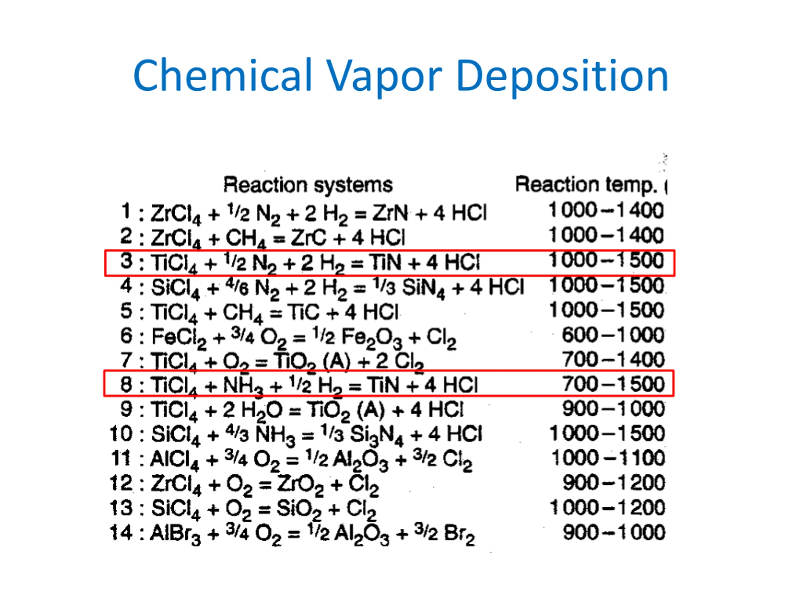 Chemical Vapor Deposition Chemical vapor deposition (CVD) is a vacuum deposition method used to produce high quality, high-performance, solid materials from a gas precursor. Thermal decomposition : SiH4(g) Si (s) + 2 H2(g) 650 C Reduction : WF6(g) + 3 H2(g) <-> W(s) + 6 HF (g) 300 C Oxidation : SiH4(g) + O2(g) SiO2(s) + 2 H2(g) 450 C Compound formation : BF3 (g) + NH3(g) BN (s) + 3 HF (g) 1100 C