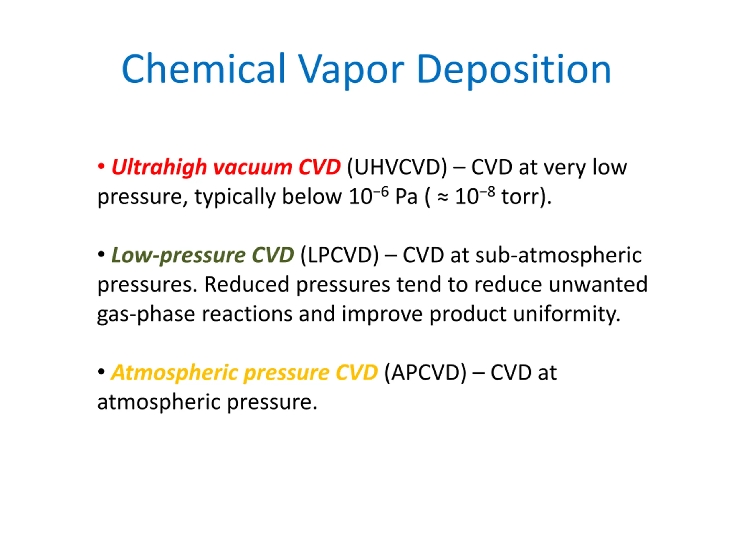 Chemical Vapor Deposition Ultrahigh vacuum CVD (UHVCVD) CVD at very low pressure, typically below 10 6 Pa ( 10 8 torr). Low-pressure CVD (LPCVD) CVD at sub-atmospheric pressures. Reduced pressures tend to reduce unwanted gas-phase reactions and improve product uniformity. Atmospheric pressure CVD (APCVD) CVD at atmospheric pressure.