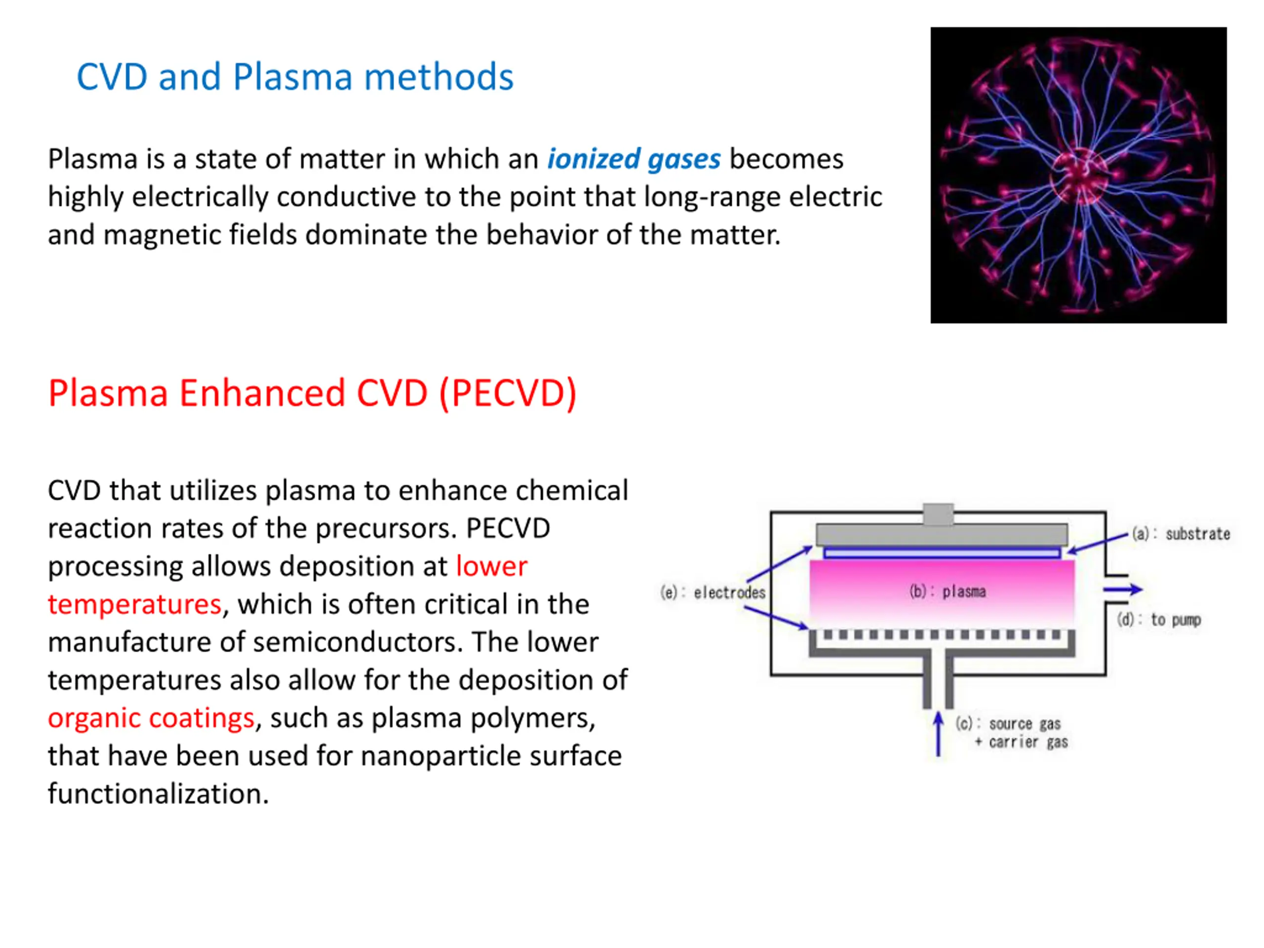 CVD and Plasma methods Plasma is a state of matter in which an ionized gases becomes highly electrically conductive to the point that long-range electric and magnetic fields dominate the behavior of the matter. Plasma Enhanced CVD (PECVD) CVD that utilizes plasma to enhance chemical reaction rates of the precursors. PECVD processing allows deposition at lower temperatures, which is often critical in the manufacture of semiconductors. The lower temperatures also allow for the deposition of organic coatings, such as plasma polymers, that have been used for nanoparticle surface functionalization.