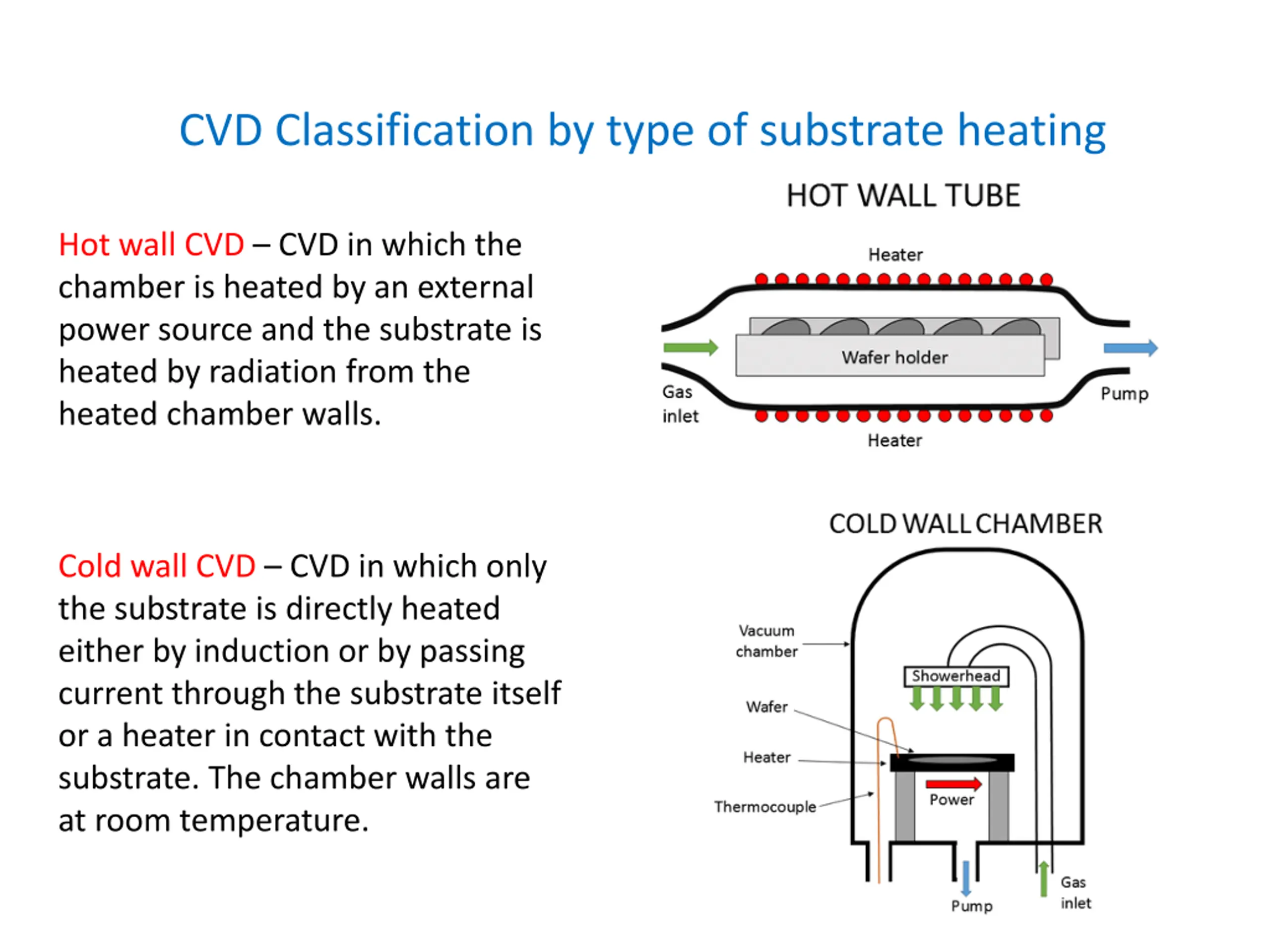 CVD Classification by type of substrate heating Hot wall CVD CVD in which the chamber is heated by an external power source and the substrate is heated by radiation from the heated chamber walls. Cold wall CVD CVD in which only the substrate is directly heated either by induction or by passing current through the substrate itself or a heater in contact with the substrate. The chamber walls are at room temperature.