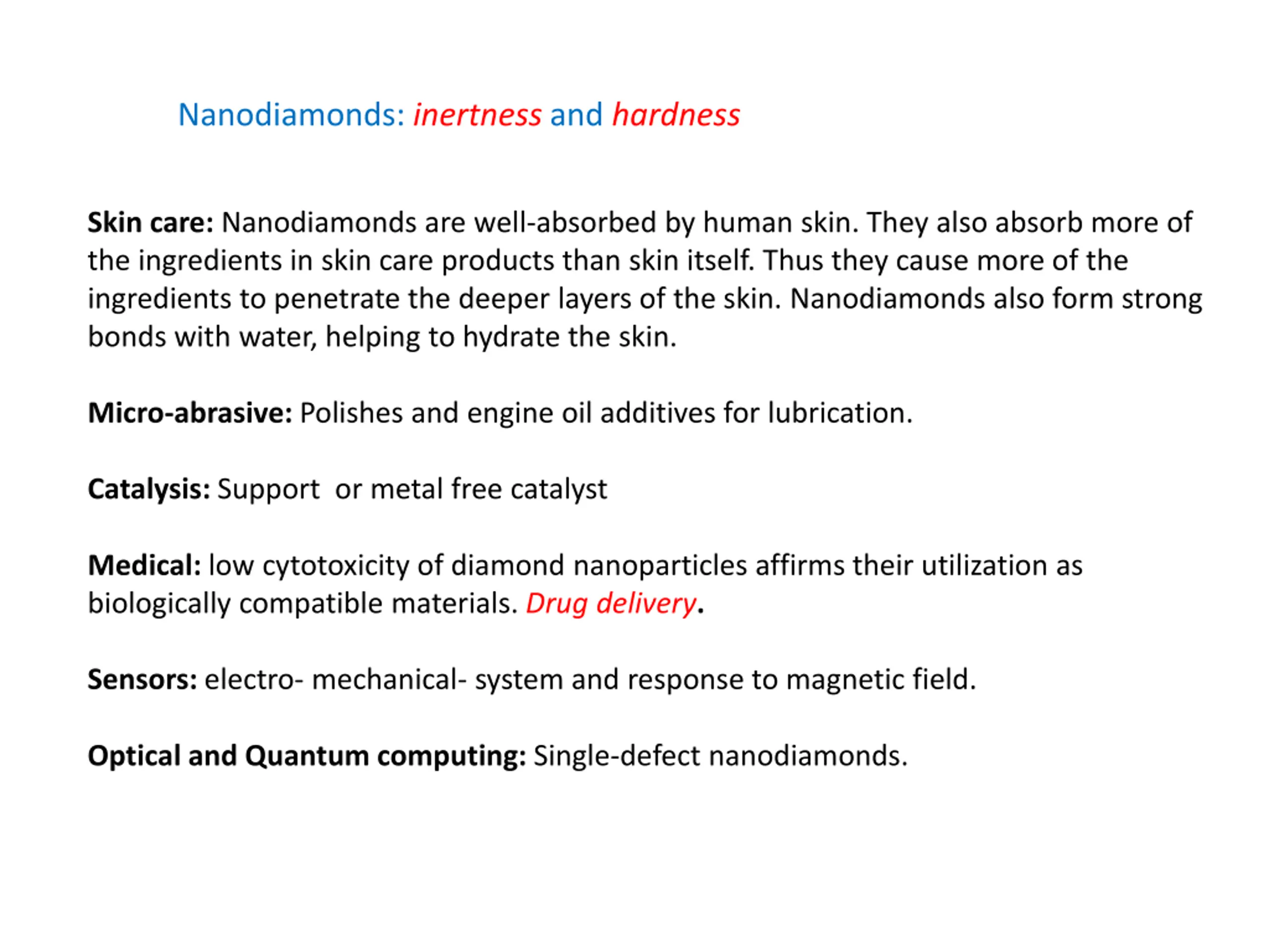 Nanodiamonds: inertness and hardness Skin care: Nanodiamonds are well-absorbed by human skin. They also absorb more of the ingredients in skin care products than skin itself. Thus they cause more of the ingredients to penetrate the deeper layers of the skin. Nanodiamonds also form strong bonds with water, helping to hydrate the skin. Micro-abrasive: Polishes and engine oil additives for lubrication. Catalysis: Support or metal free catalyst Medical: low cytotoxicity of diamond nanoparticles affirms their utilization as biologically compatible materials. Drug delivery. Sensors: electro- mechanical- system and response to magnetic field. Optical and Quantum computing: Single-defect nanodiamonds.