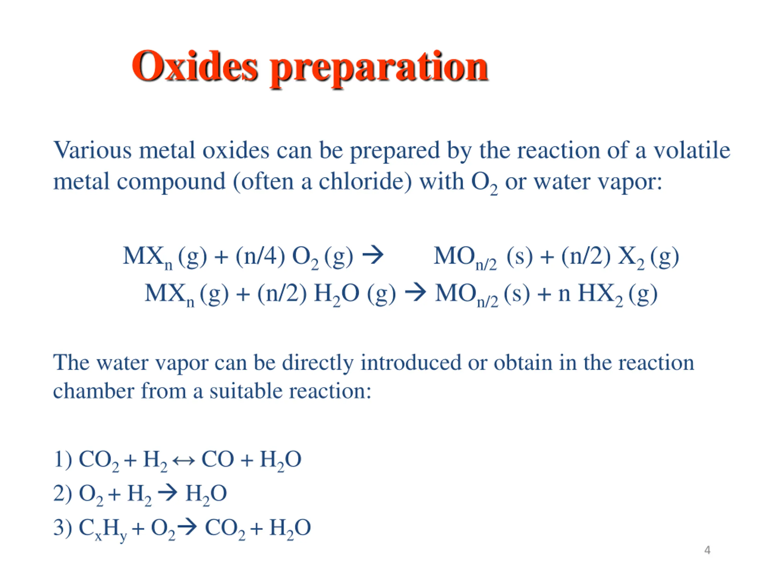 Oxides preparation Various metal oxides can be prepared by the reaction of a volatile metal compound (often a chloride) with O2 or water vapor: MXn (g) + (n/4) O2 (g) MXn (g) + (n/2) H2O (g) MOn/2 (s) + n HX2 (g) MOn/2 (s) + (n/2) X2 (g) The water vapor can be directly introduced or obtain in the reaction chamber from a suitable reaction: 1) CO2 + H2 2) O2 + H2 H2O 3) CxHy + O2 CO2 + H2O CO + H2O 4