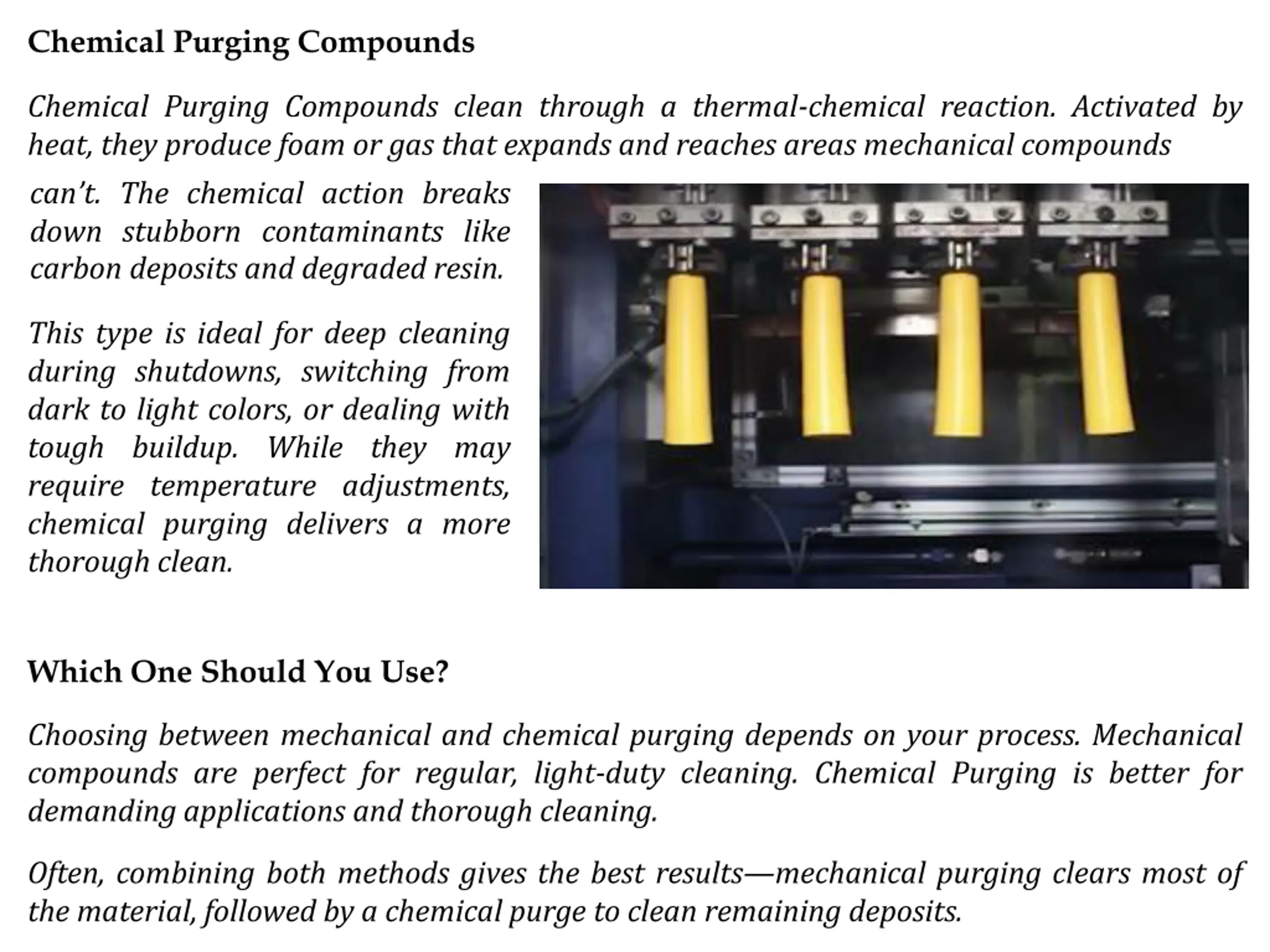 Chemical Purging Compounds Chemical Purging Compounds clean through a thermal-chemical reaction. Activated by heat, they produce foam or gas that expands and reaches areas mechanical compounds can t. The chemical action breaks down stubborn contaminants like carbon deposits and degraded resin. This type is ideal for deep cleaning during shutdowns, switching from dark to light colors, or dealing with tough buildup. While they may require temperature adjustments, chemical purging delivers a more thorough clean. Which One Should You Use? Choosing between mechanical and chemical purging depends on your process. Mechanical compounds are perfect for regular, light-duty cleaning. Chemical Purging is better for demanding applications and thorough cleaning. Often, combining both methods gives the best results mechanical purging clears most of the material, followed by a chemical purge to clean remaining deposits.