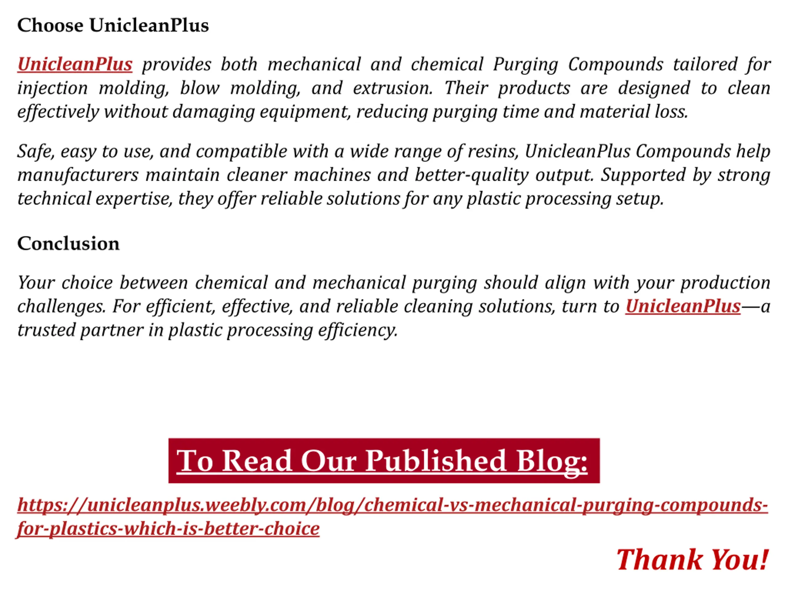 Choose UnicleanPlus UnicleanPlus provides both mechanical and chemical Purging Compounds tailored for injection molding, blow molding, and extrusion. Their products are designed to clean effectively without damaging equipment, reducing purging time and material loss. Safe, easy to use, and compatible with a wide range of resins, UnicleanPlus Compounds help manufacturers maintain cleaner machines and better-quality output. Supported by strong technical expertise, they offer reliable solutions for any plastic processing setup. Conclusion Your choice between chemical and mechanical purging should align with your production challenges. For efficient, effective, and reliable cleaning solutions, turn to UnicleanPlus a trusted partner in plastic processing efficiency. To Read Our Published Blog: https://unicleanplus.weebly.com/blog/chemical-vs-mechanical-purging-compounds- for-plastics-which-is-better-choice Thank You!