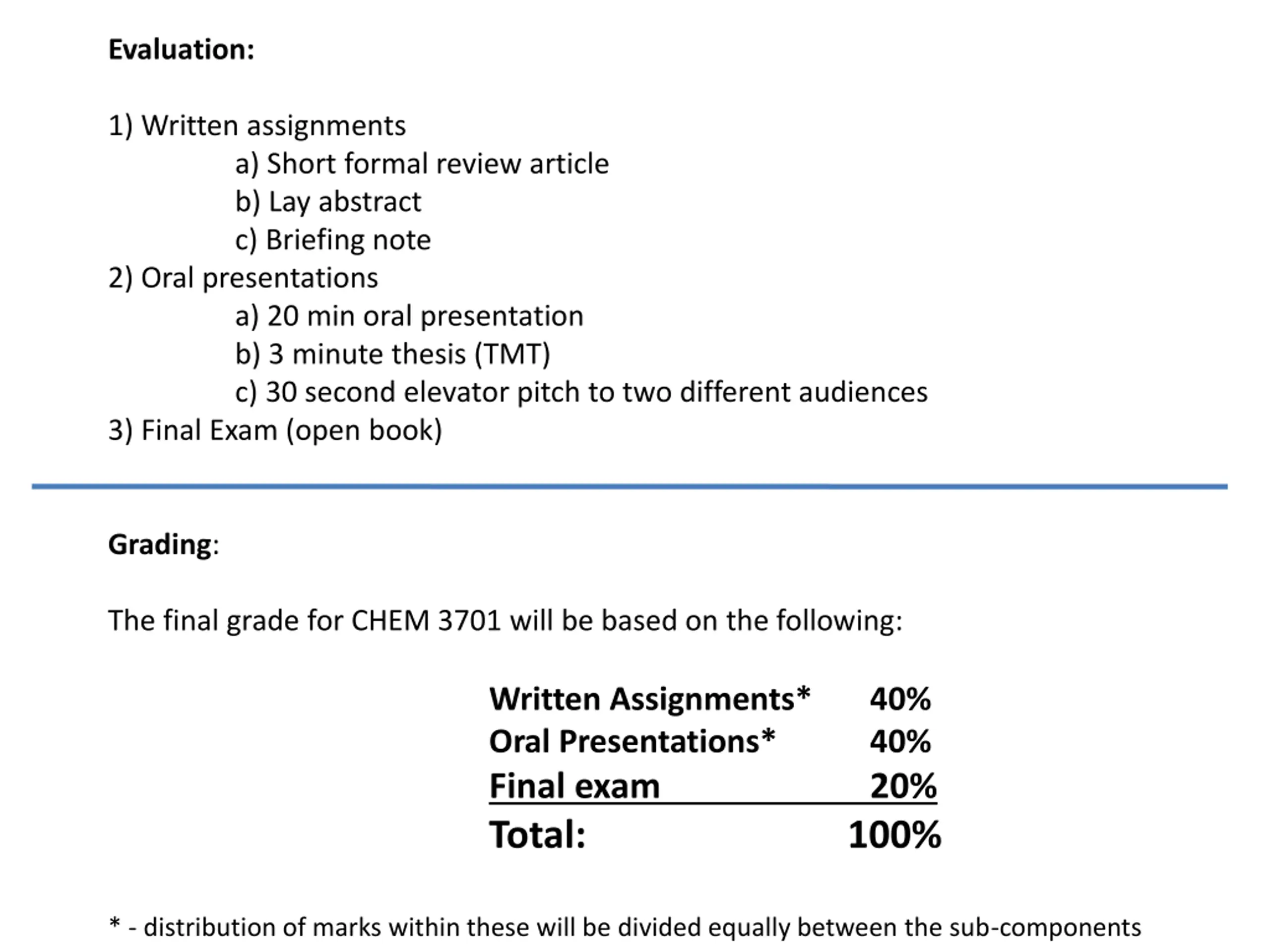 Evaluation: 1) Written assignments a) Short formal review article b) Lay abstract c) Briefing note 2) Oral presentations a) 20 min oral presentation b) 3 minute thesis (TMT) c) 30 second elevator pitch to two different audiences 3) Final Exam (open book) Grading: The final grade for CHEM 3701 will be based on the following: Written Assignments* Oral Presentations* Final exam Total: 40% 40% 20% 100% * - distribution of marks within these will be divided equally between the sub-components