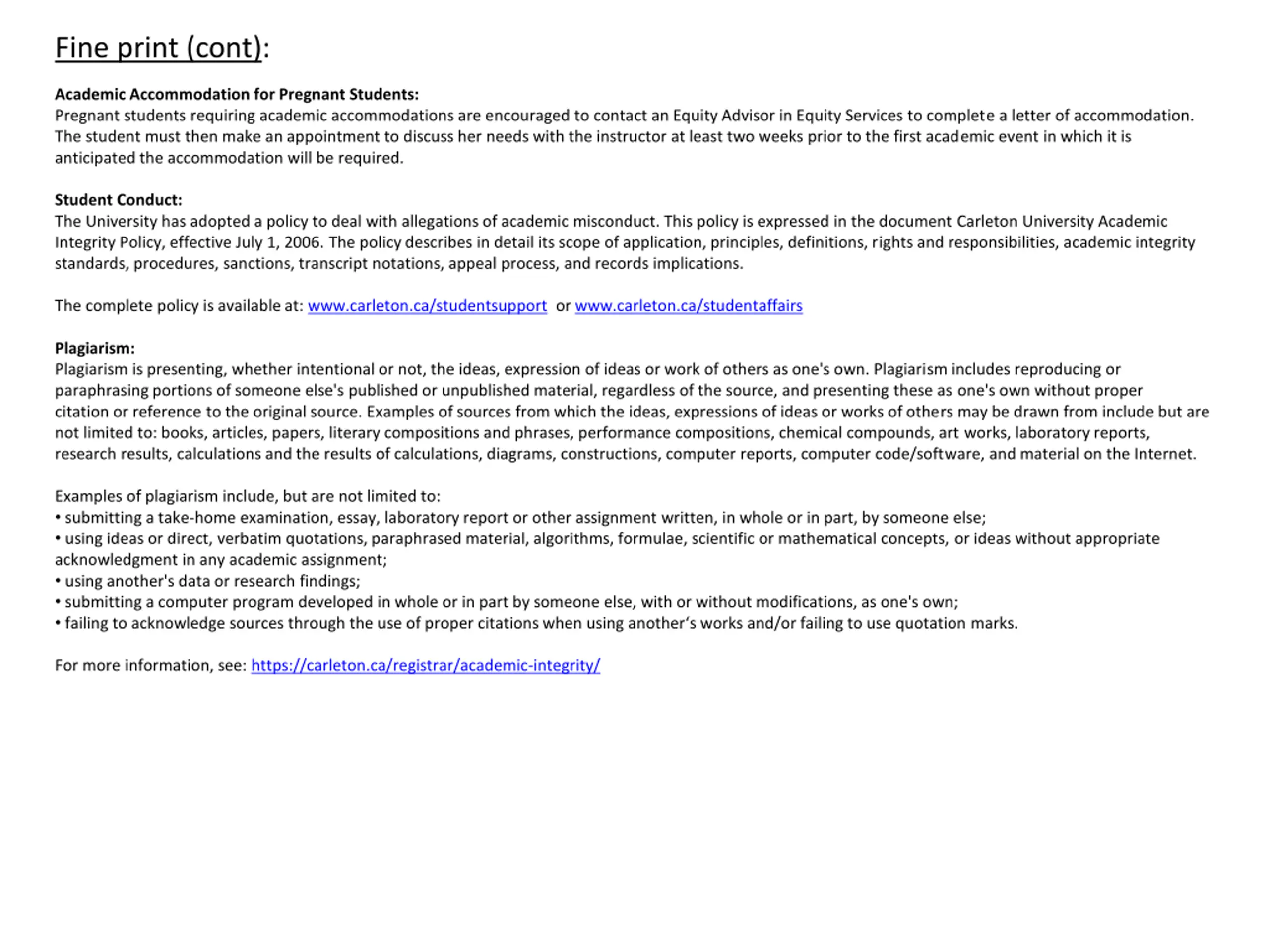 Fine print (cont): Academic Accommodation for Pregnant Students: Pregnant students requiring academic accommodations are encouraged to contact an Equity Advisor in Equity Services to complete a letter of accommodation. The student must then make an appointment to discuss her needs with the instructor at least two weeks prior to the first academic event in which it is anticipated the accommodation will be required. Student Conduct: The University has adopted a policy to deal with allegations of academic misconduct. This policy is expressed in the document Carleton University Academic Integrity Policy, effective July 1, 2006. The policy describes in detail its scope of application, principles, definitions, rights and responsibilities, academic integrity standards, procedures, sanctions, transcript notations, appeal process, and records implications. The complete policy is available at: www.carleton.ca/studentsupport or www.carleton.ca/studentaffairs Plagiarism: Plagiarism is presenting, whether intentional or not, the ideas, expression of ideas or work of others as one's own. Plagiarism includes reproducing or paraphrasing portions of someone else's published or unpublished material, regardless of the source, and presenting these as one's own without proper citation or reference to the original source. Examples of sources from which the ideas, expressions of ideas or works of others may be drawn from include but are not limited to: books, articles, papers, literary compositions and phrases, performance compositions, chemical compounds, art works, laboratory reports, research results, calculations and the results of calculations, diagrams, constructions, computer reports, computer code/software, and material on the Internet. Examples of plagiarism include, but are not limited to: submitting a take-home examination, essay, laboratory report or other assignment written, in whole or in part, by someone else; using ideas or direct, verbatim quotations, paraphrased material, algorithms, formulae, scientific or mathematical concepts, or ideas without appropriate acknowledgment in any academic assignment; using another's data or research findings; submitting a computer program developed in whole or in part by someone else, with or without modifications, as one's own; failing to acknowledge sources through the use of proper citations when using another s works and/or failing to use quotation marks. For more information, see: https://carleton.ca/registrar/academic-integrity/