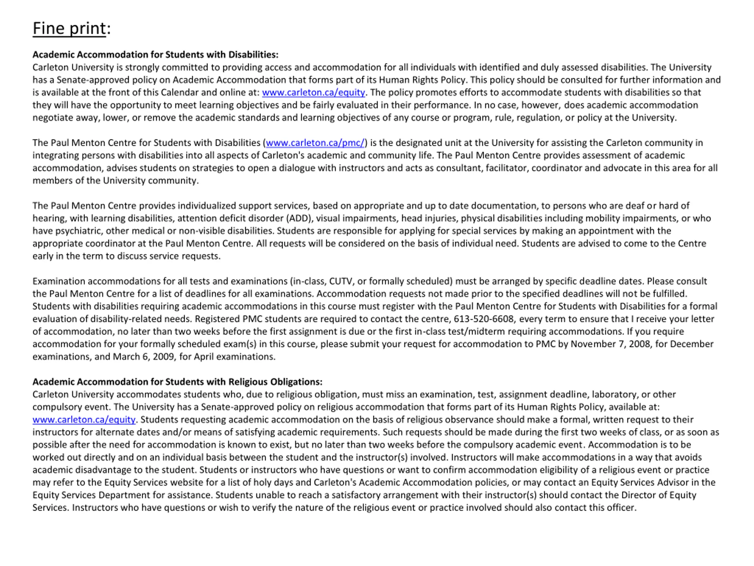Fine print: Academic Accommodation for Students with Disabilities: Carleton University is strongly committed to providing access and accommodation for all individuals with identified and duly assessed disabilities. The University has a Senate-approved policy on Academic Accommodation that forms part of its Human Rights Policy. This policy should be consulted for further information and is available at the front of this Calendar and online at: www.carleton.ca/equity. The policy promotes efforts to accommodate students with disabilities so that they will have the opportunity to meet learning objectives and be fairly evaluated in their performance. In no case, however, does academic accommodation negotiate away, lower, or remove the academic standards and learning objectives of any course or program, rule, regulation, or policy at the University. The Paul Menton Centre for Students with Disabilities (www.carleton.ca/pmc/) is the designated unit at the University for assisting the Carleton community in integrating persons with disabilities into all aspects of Carleton's academic and community life. The Paul Menton Centre provides assessment of academic accommodation, advises students on strategies to open a dialogue with instructors and acts as consultant, facilitator, coordinator and advocate in this area for all members of the University community. The Paul Menton Centre provides individualized support services, based on appropriate and up to date documentation, to persons who are deaf or hard of hearing, with learning disabilities, attention deficit disorder (ADD), visual impairments, head injuries, physical disabilities including mobility impairments, or who have psychiatric, other medical or non-visible disabilities. Students are responsible for applying for special services by making an appointment with the appropriate coordinator at the Paul Menton Centre. All requests will be considered on the basis of individual need. Students are advised to come to the Centre early in the term to discuss service requests. Examination accommodations for all tests and examinations (in-class, CUTV, or formally scheduled) must be arranged by specific deadline dates. Please consult the Paul Menton Centre for a list of deadlines for all examinations. Accommodation requests not made prior to the specified deadlines will not be fulfilled. Students with disabilities requiring academic accommodations in this course must register with the Paul Menton Centre for Students with Disabilities for a formal evaluation of disability-related needs. Registered PMC students are required to contact the centre, 613-520-6608, every term to ensure that I receive your letter of accommodation, no later than two weeks before the first assignment is due or the first in-class test/midterm requiring accommodations. If you require accommodation for your formally scheduled exam(s) in this course, please submit your request for accommodation to PMC by November 7, 2008, for December examinations, and March 6, 2009, for April examinations. Academic Accommodation for Students with Religious Obligations: Carleton University accommodates students who, due to religious obligation, must miss an examination, test, assignment deadline, laboratory, or other compulsory event. The University has a Senate-approved policy on religious accommodation that forms part of its Human Rights Policy, available at: www.carleton.ca/equity. Students requesting academic accommodation on the basis of religious observance should make a formal, written request to their instructors for alternate dates and/or means of satisfying academic requirements. Such requests should be made during the first two weeks of class, or as soon as possible after the need for accommodation is known to exist, but no later than two weeks before the compulsory academic event. Accommodation is to be worked out directly and on an individual basis between the student and the instructor(s) involved. Instructors will make accommodations in a way that avoids academic disadvantage to the student. Students or instructors who have questions or want to confirm accommodation eligibility of a religious event or practice may refer to the Equity Services website for a list of holy days and Carleton's Academic Accommodation policies, or may contact an Equity Services Advisor in the Equity Services Department for assistance. Students unable to reach a satisfactory arrangement with their instructor(s) should contact the Director of Equity Services. Instructors who have questions or wish to verify the nature of the religious event or practice involved should also contact this officer.