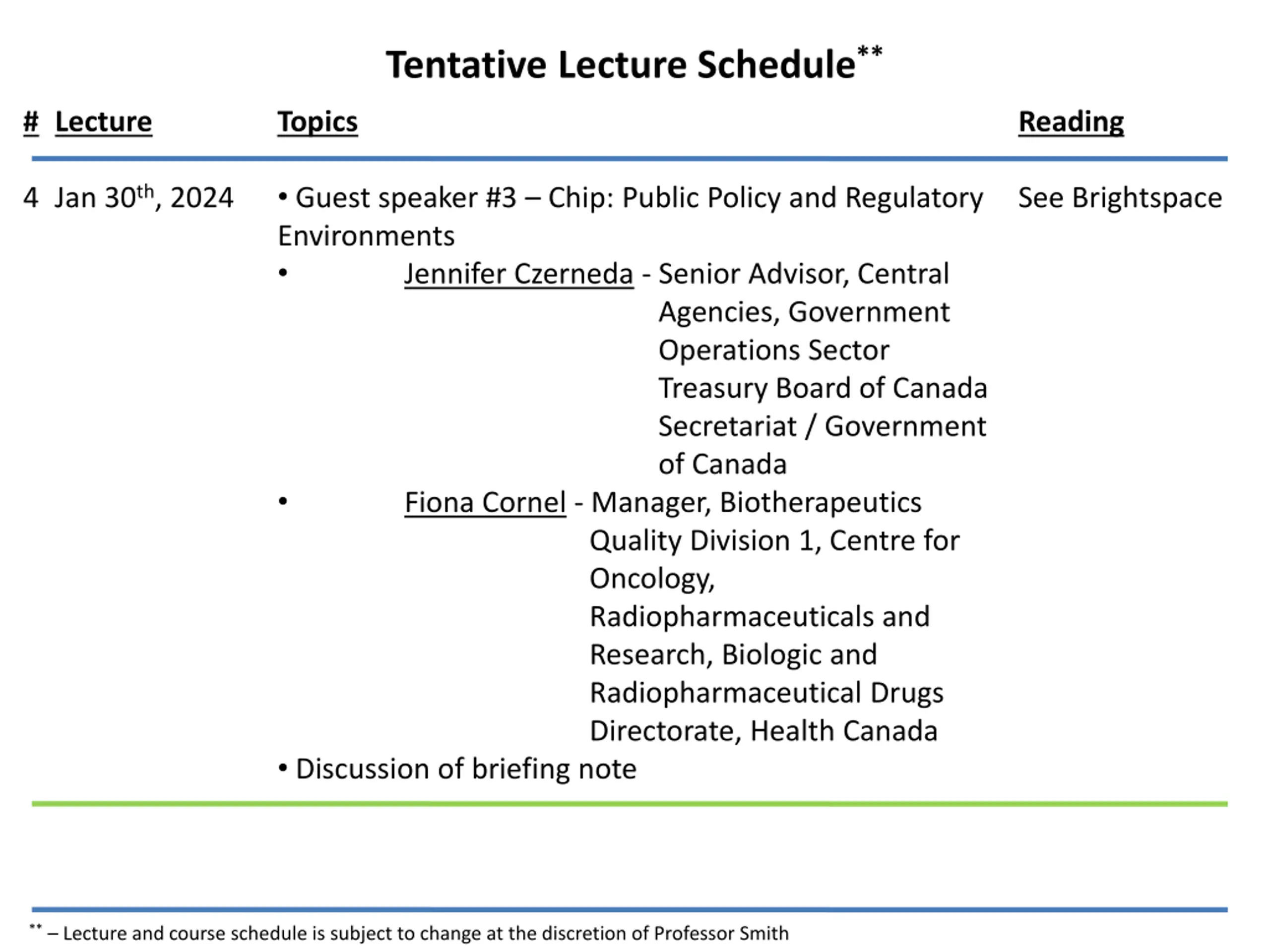 Tentative Lecture Schedule** # Lecture Topics Reading Guest speaker #3 Chip: Public Policy and Regulatory Environments Jennifer Czerneda - Senior Advisor, Central Fiona Cornel - Manager, Biotherapeutics Quality Division 1, Centre for Oncology, Radiopharmaceuticals and Research, Biologic and Radiopharmaceutical Drugs Directorate, Health Canada Discussion of briefing note Jan 30th, 2024 4 See Brightspace Agencies, Government Operations Sector Treasury Board of Canada Secretariat / Government of Canada ** Lecture and course schedule is subject to change at the discretion of Professor Smith