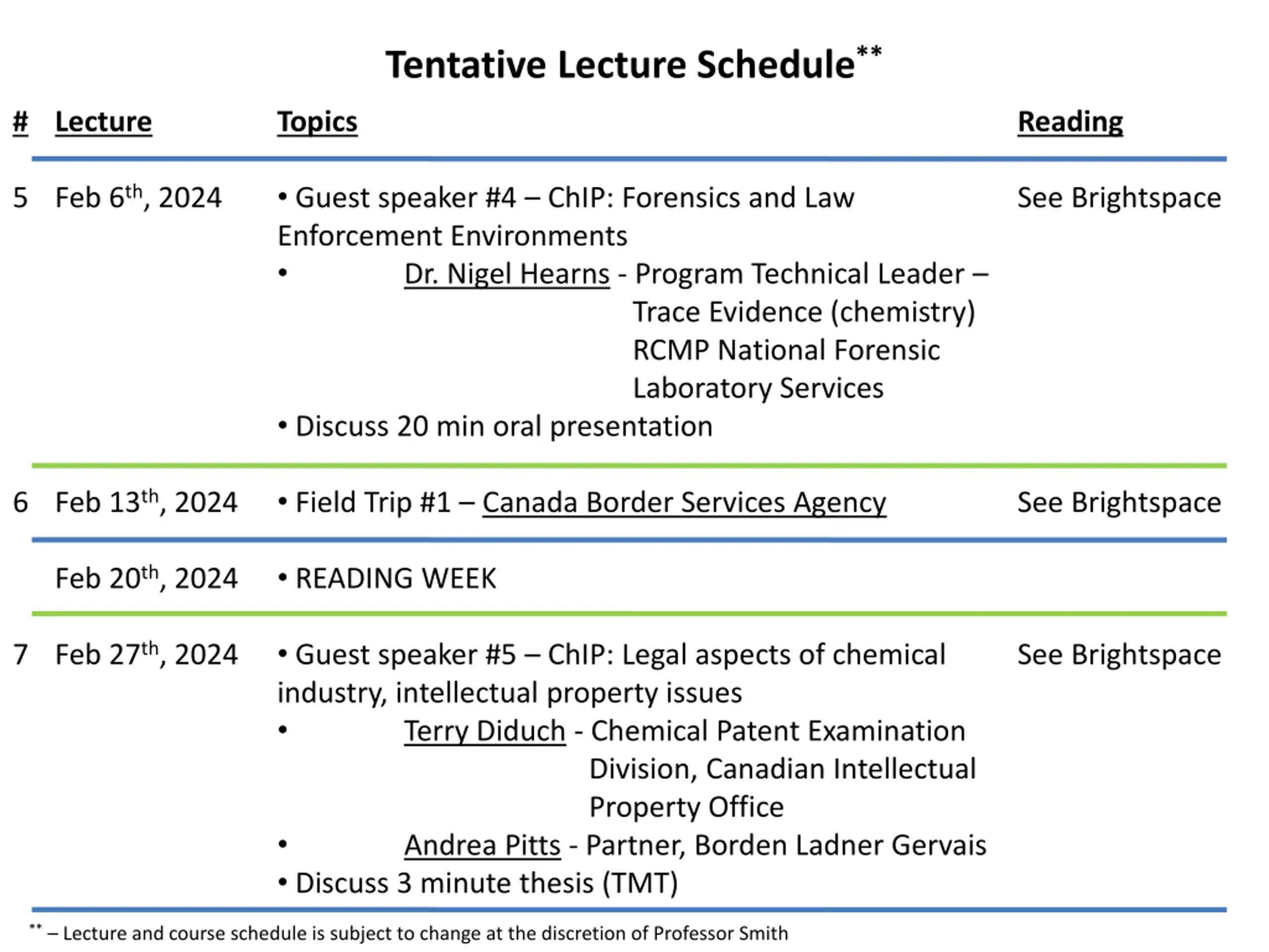 Tentative Lecture Schedule** # Lecture Topics Reading Guest speaker #4 ChIP: Forensics and Law Enforcement Environments Dr. Nigel Hearns - Program Technical Leader Trace Evidence (chemistry) RCMP National Forensic Laboratory Services Discuss 20 min oral presentation Feb 6th, 2024 5 See Brightspace Field Trip #1 Canada Border Services Agency Feb 13th, 2024 6 See Brightspace READING WEEK Feb 20th, 2024 Guest speaker #5 ChIP: Legal aspects of chemical industry, intellectual property issues Terry Diduch - Chemical Patent Examination Division, Canadian Intellectual Property Office Andrea Pitts - Partner, Borden Ladner Gervais Discuss 3 minute thesis (TMT) Feb 27th, 2024 7 See Brightspace ** Lecture and course schedule is subject to change at the discretion of Professor Smith