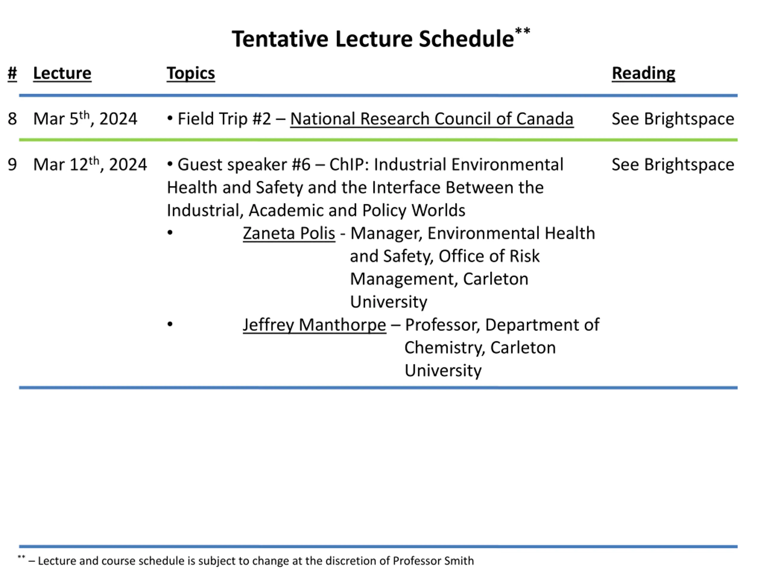 Tentative Lecture Schedule** # Lecture Topics Reading Field Trip #2 National Research Council of Canada Mar 5th, 2024 8 See Brightspace Guest speaker #6 ChIP: Industrial Environmental Health and Safety and the Interface Between the Industrial, Academic and Policy Worlds Zaneta Polis - Manager, Environmental Health and Safety, Office of Risk Management, Carleton University Jeffrey Manthorpe Professor, Department of Mar 12th, 2024 9 See Brightspace Chemistry, Carleton University ** Lecture and course schedule is subject to change at the discretion of Professor Smith