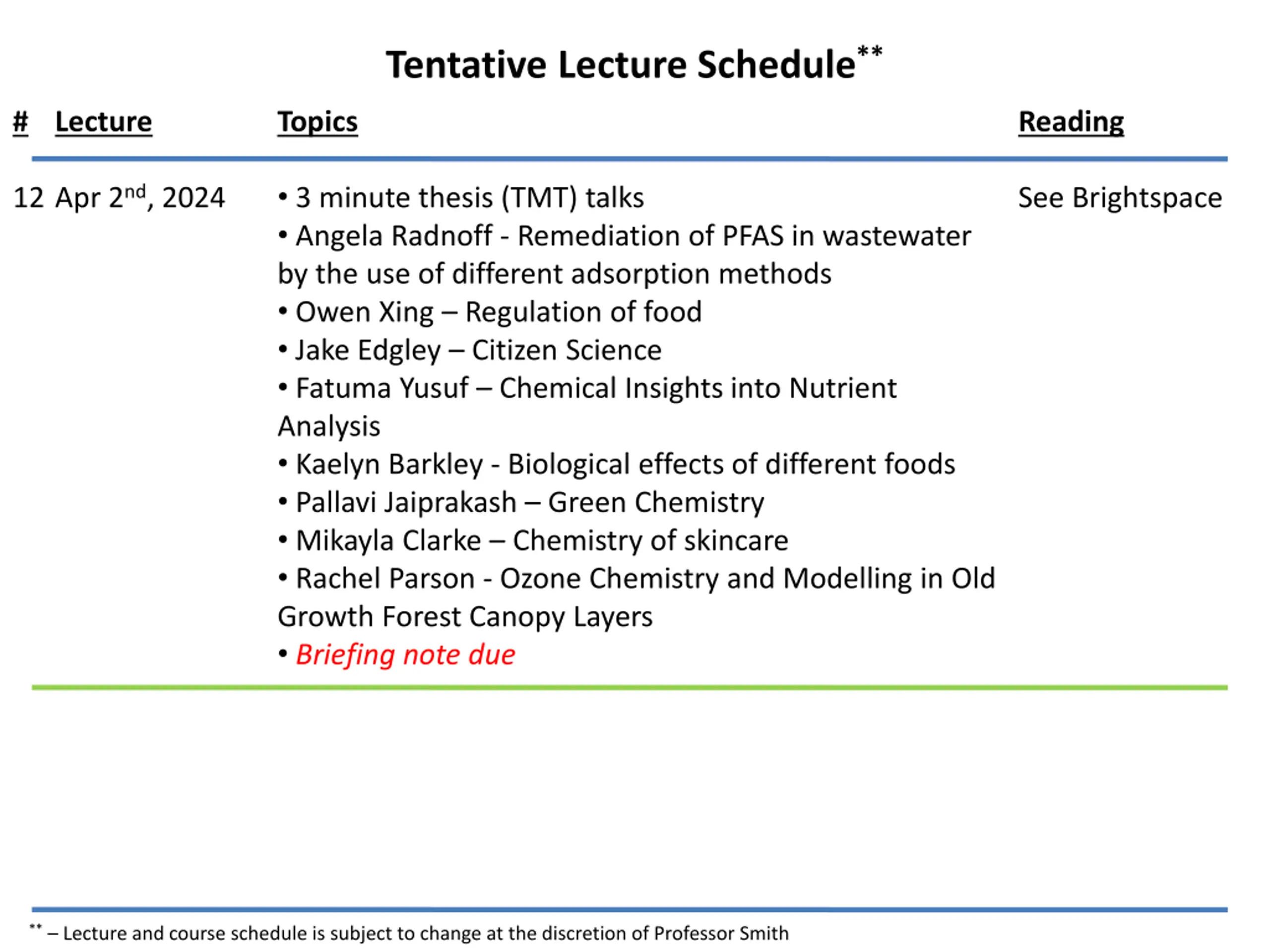 Tentative Lecture Schedule** # Lecture Topics Reading 3 minute thesis (TMT) talks Angela Radnoff - Remediation of PFAS in wastewater by the use of different adsorption methods Owen Xing Regulation of food Jake Edgley Citizen Science Fatuma Yusuf Chemical Insights into Nutrient Analysis Kaelyn Barkley - Biological effects of different foods Pallavi Jaiprakash Green Chemistry Mikayla Clarke Chemistry of skincare Rachel Parson - Ozone Chemistry and Modelling in Old Growth Forest Canopy Layers Briefing note due Apr 2nd, 2024 12 See Brightspace ** Lecture and course schedule is subject to change at the discretion of Professor Smith