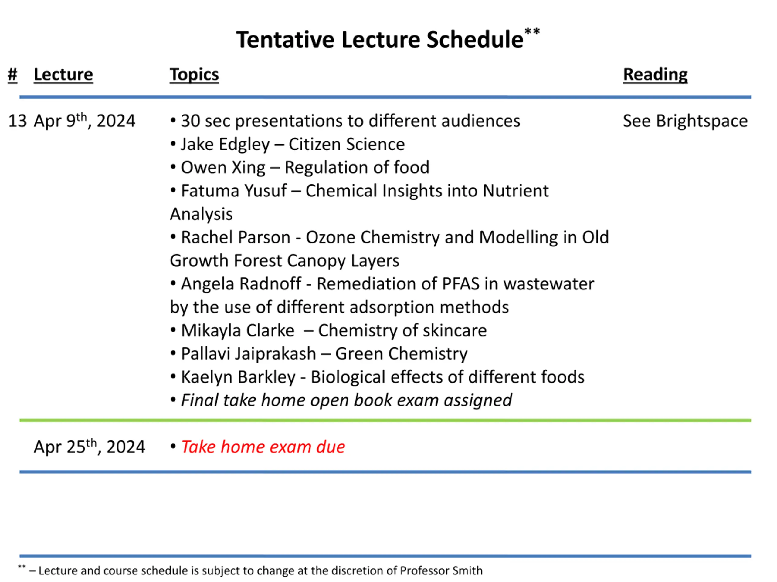 Tentative Lecture Schedule** # Lecture Topics Reading 30 sec presentations to different audiences Jake Edgley Citizen Science Owen Xing Regulation of food Fatuma Yusuf Chemical Insights into Nutrient Analysis Rachel Parson - Ozone Chemistry and Modelling in Old Growth Forest Canopy Layers Angela Radnoff - Remediation of PFAS in wastewater by the use of different adsorption methods Mikayla Clarke Chemistry of skincare Pallavi Jaiprakash Green Chemistry Kaelyn Barkley - Biological effects of different foods Final take home open book exam assigned Apr 9th, 2024 13 See Brightspace Take home exam due Apr 25th, 2024 ** Lecture and course schedule is subject to change at the discretion of Professor Smith