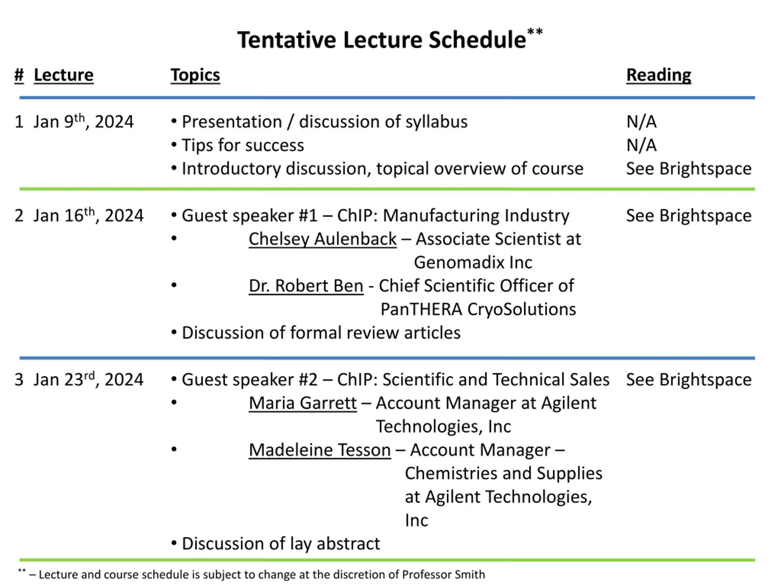 Tentative Lecture Schedule** # Lecture Topics Reading Presentation / discussion of syllabus Tips for success Introductory discussion, topical overview of course Jan 9th, 2024 1 N/A N/A See Brightspace Guest speaker #1 ChIP: Manufacturing Industry Chelsey Aulenback Associate Scientist at Dr. Robert Ben - Chief Scientific Officer of PanTHERA CryoSolutions Discussion of formal review articles Jan 16th, 2024 2 See Brightspace Genomadix Inc Guest speaker #2 ChIP: Scientific and Technical Sales Maria Garrett Account Manager at Agilent Technologies, Inc Madeleine Tesson Account Manager Jan 23rd, 2024 3 See Brightspace Chemistries and Supplies at Agilent Technologies, Inc Discussion of lay abstract ** Lecture and course schedule is subject to change at the discretion of Professor Smith