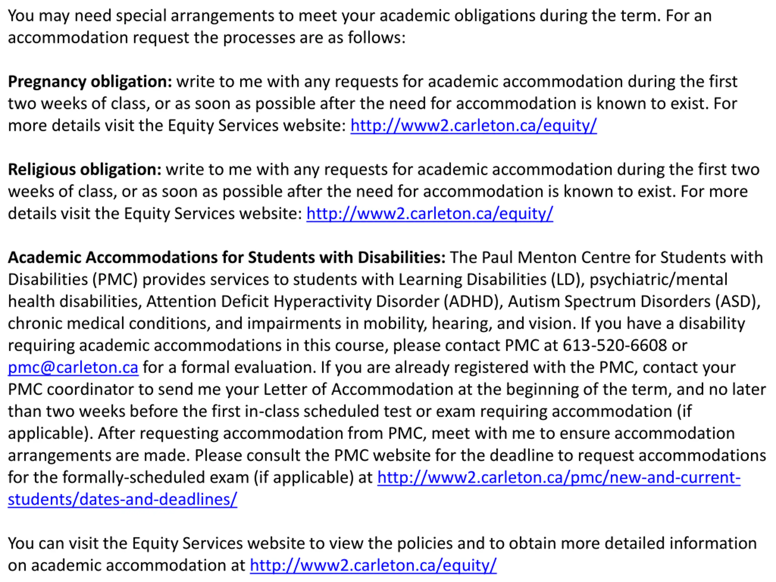 You may need special arrangements to meet your academic obligations during the term. For an accommodation request the processes are as follows: Pregnancy obligation: write to me with any requests for academic accommodation during the first two weeks of class, or as soon as possible after the need for accommodation is known to exist. For more details visit the Equity Services website: http://www2.carleton.ca/equity/ Religious obligation: write to me with any requests for academic accommodation during the first two weeks of class, or as soon as possible after the need for accommodation is known to exist. For more details visit the Equity Services website: http://www2.carleton.ca/equity/ Academic Accommodations for Students with Disabilities: The Paul Menton Centre for Students with Disabilities (PMC) provides services to students with Learning Disabilities (LD), psychiatric/mental health disabilities, Attention Deficit Hyperactivity Disorder (ADHD), Autism Spectrum Disorders (ASD), chronic medical conditions, and impairments in mobility, hearing, and vision. If you have a disability requiring academic accommodations in this course, please contact PMC at 613-520-6608 or pmc@carleton.ca for a formal evaluation. If you are already registered with the PMC, contact your PMC coordinator to send me your Letter of Accommodation at the beginning of the term, and no later than two weeks before the first in-class scheduled test or exam requiring accommodation (if applicable). After requesting accommodation from PMC, meet with me to ensure accommodation arrangements are made. Please consult the PMC website for the deadline to request accommodations for the formally-scheduled exam (if applicable) at http://www2.carleton.ca/pmc/new-and-current- students/dates-and-deadlines/ You can visit the Equity Services website to view the policies and to obtain more detailed information on academic accommodation at http://www2.carleton.ca/equity/