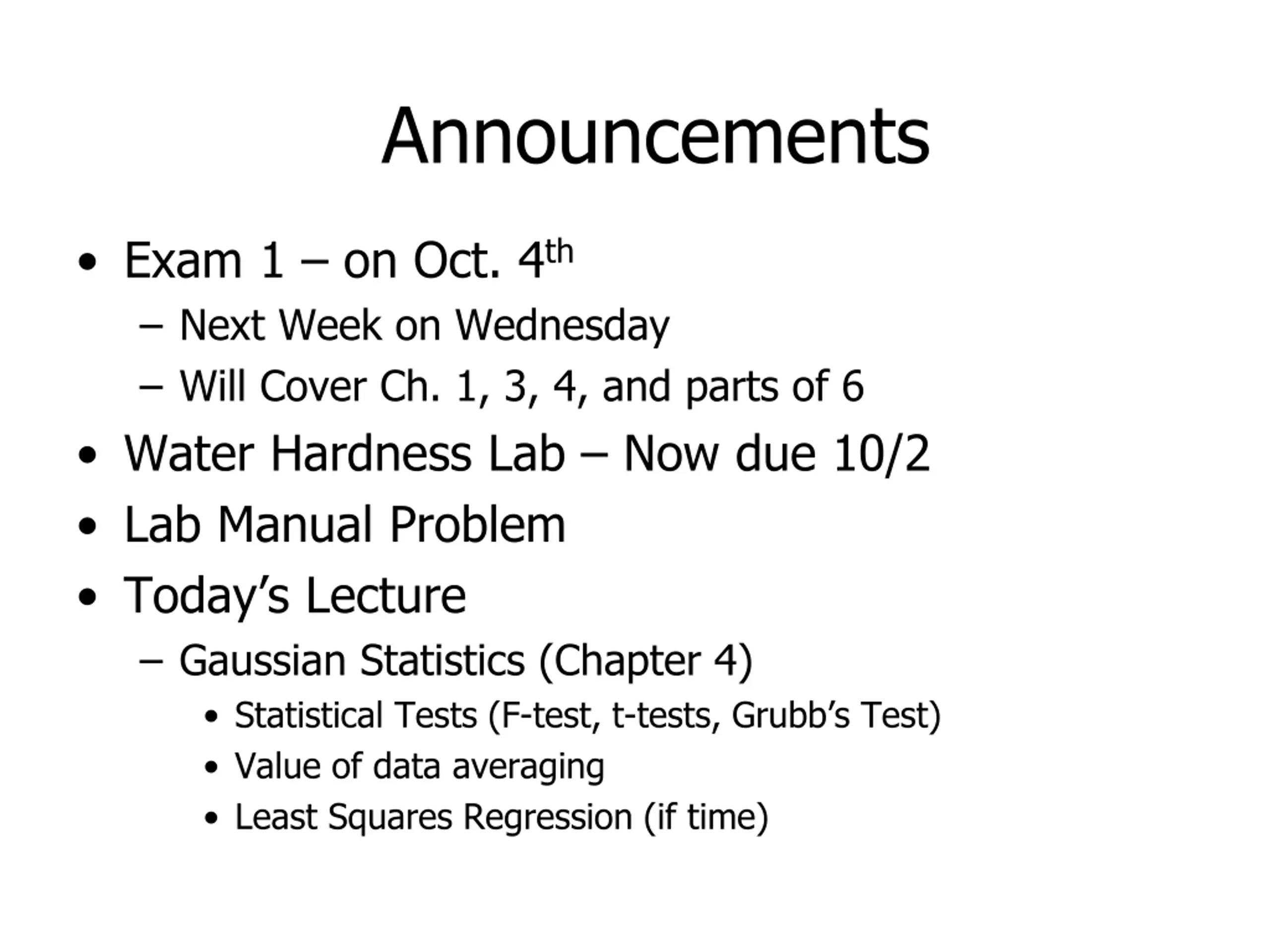 Announcements Exam 1 on Oct. 4th Next Week on Wednesday Will Cover Ch. 1, 3, 4, and parts of 6 Water Hardness Lab Now due 10/2 Lab Manual Problem Today s Lecture Gaussian Statistics (Chapter 4) Statistical Tests (F-test, t-tests, Grubb s Test) Value of data averaging Least Squares Regression (if time)