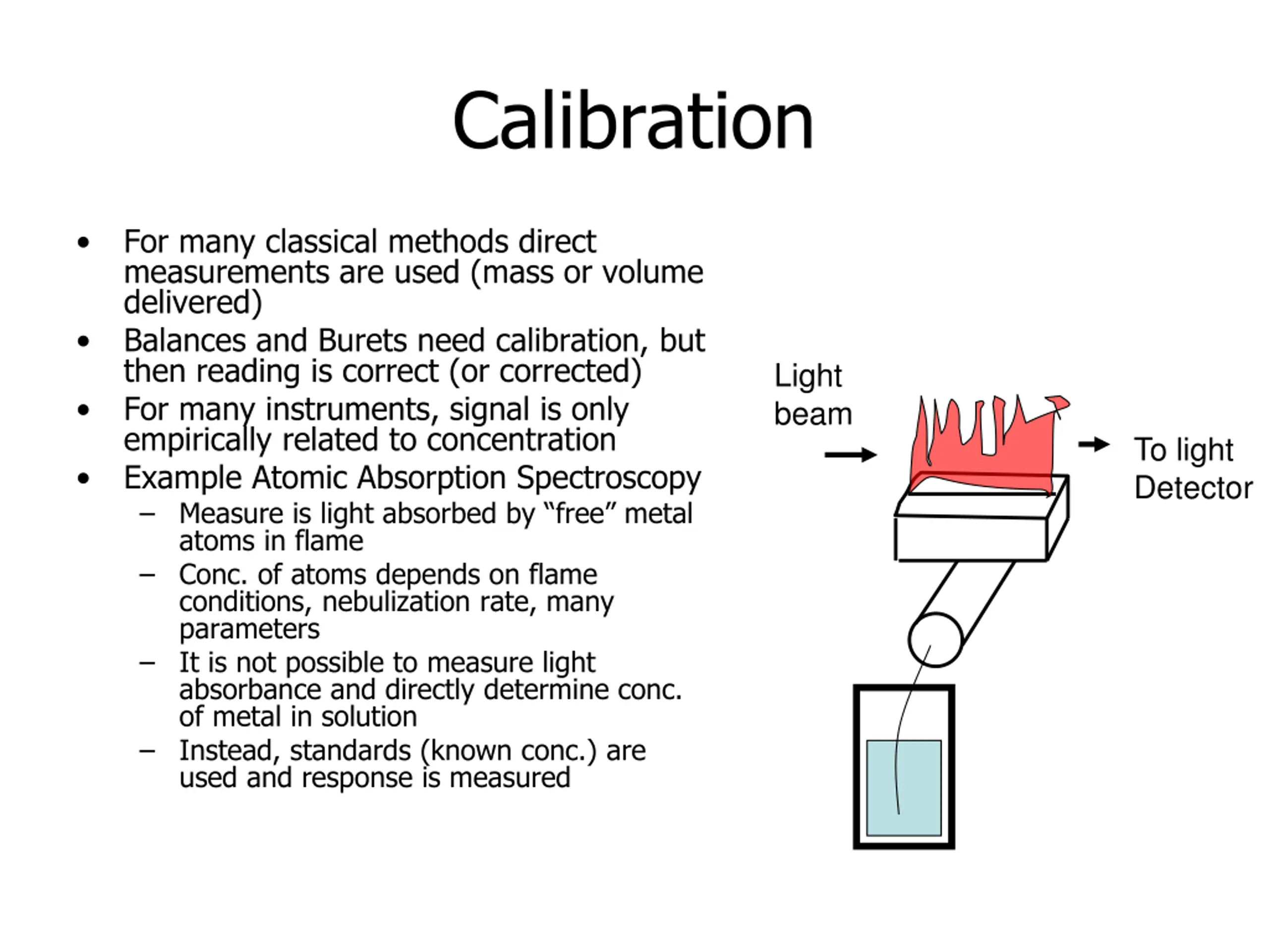 Calibration For many classical methods direct measurements are used (mass or volume delivered) Balances and Burets need calibration, but then reading is correct (or corrected) For many instruments, signal is only empirically related to concentration Example Atomic Absorption Spectroscopy Measure is light absorbed by free metal atoms in flame Conc. of atoms depends on flame conditions, nebulization rate, many parameters It is not possible to measure light absorbance and directly determine conc. of metal in solution Instead, standards (known conc.) are used and response is measured Light beam To light Detector