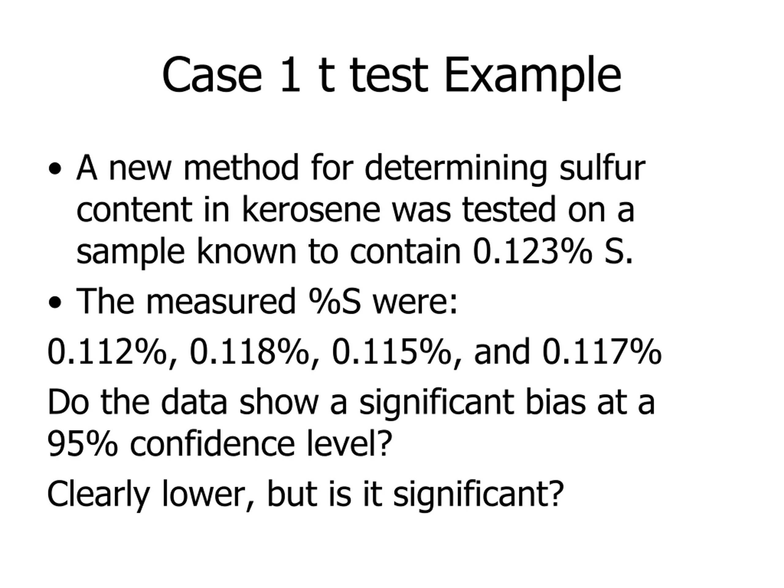 Case 1 t test Example A new method for determining sulfur content in kerosene was tested on a sample known to contain 0.123% S. The measured %S were: 0.112%, 0.118%, 0.115%, and 0.117% Do the data show a significant bias at a 95% confidence level? Clearly lower, but is it significant?