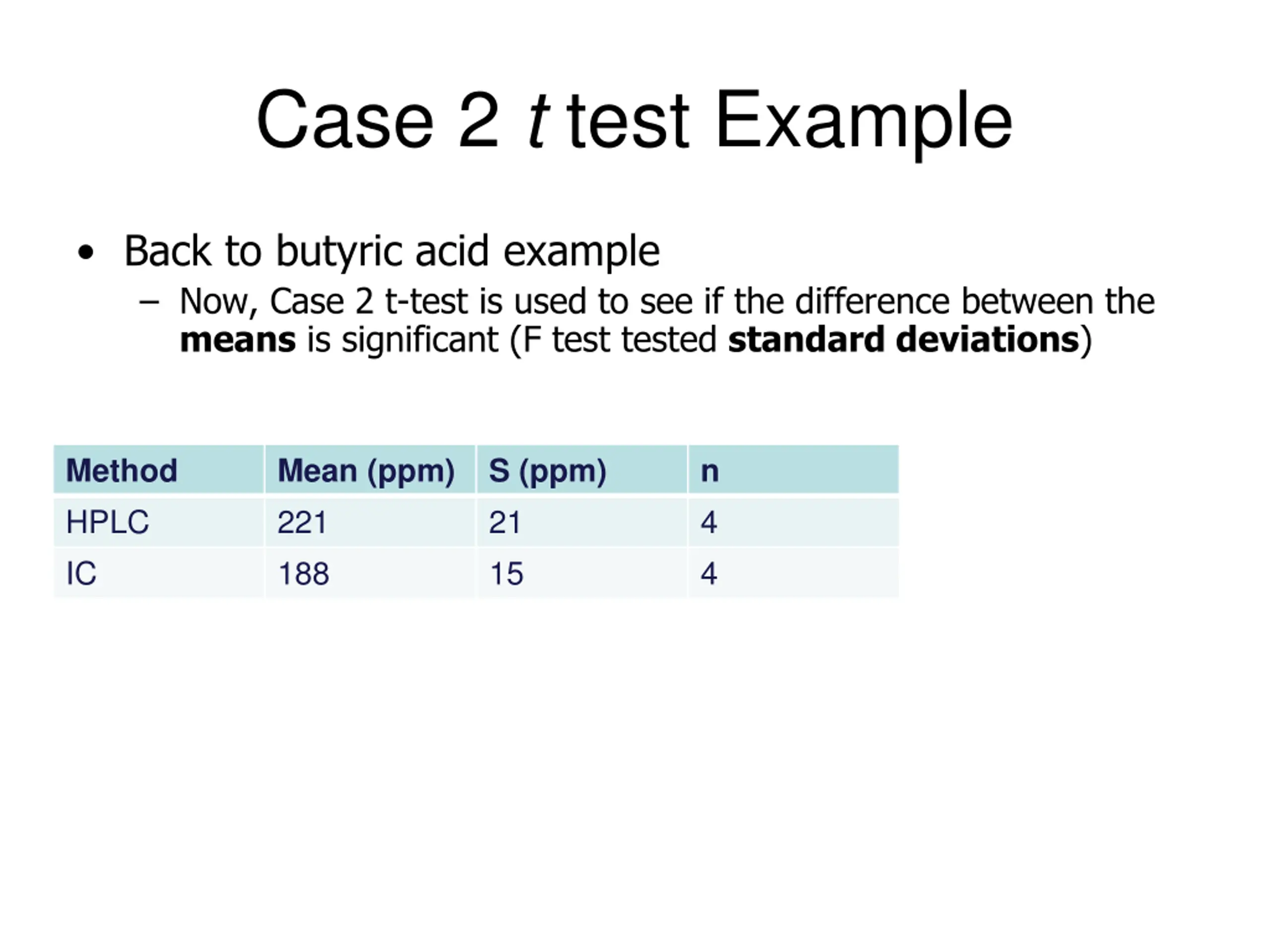 Case 2 t test Example Back to butyric acid example Now, Case 2 t-test is used to see if the difference between the means is significant (F test tested standard deviations) Method HPLC IC Mean (ppm) 221 188 S (ppm) 21 15 n 4 4