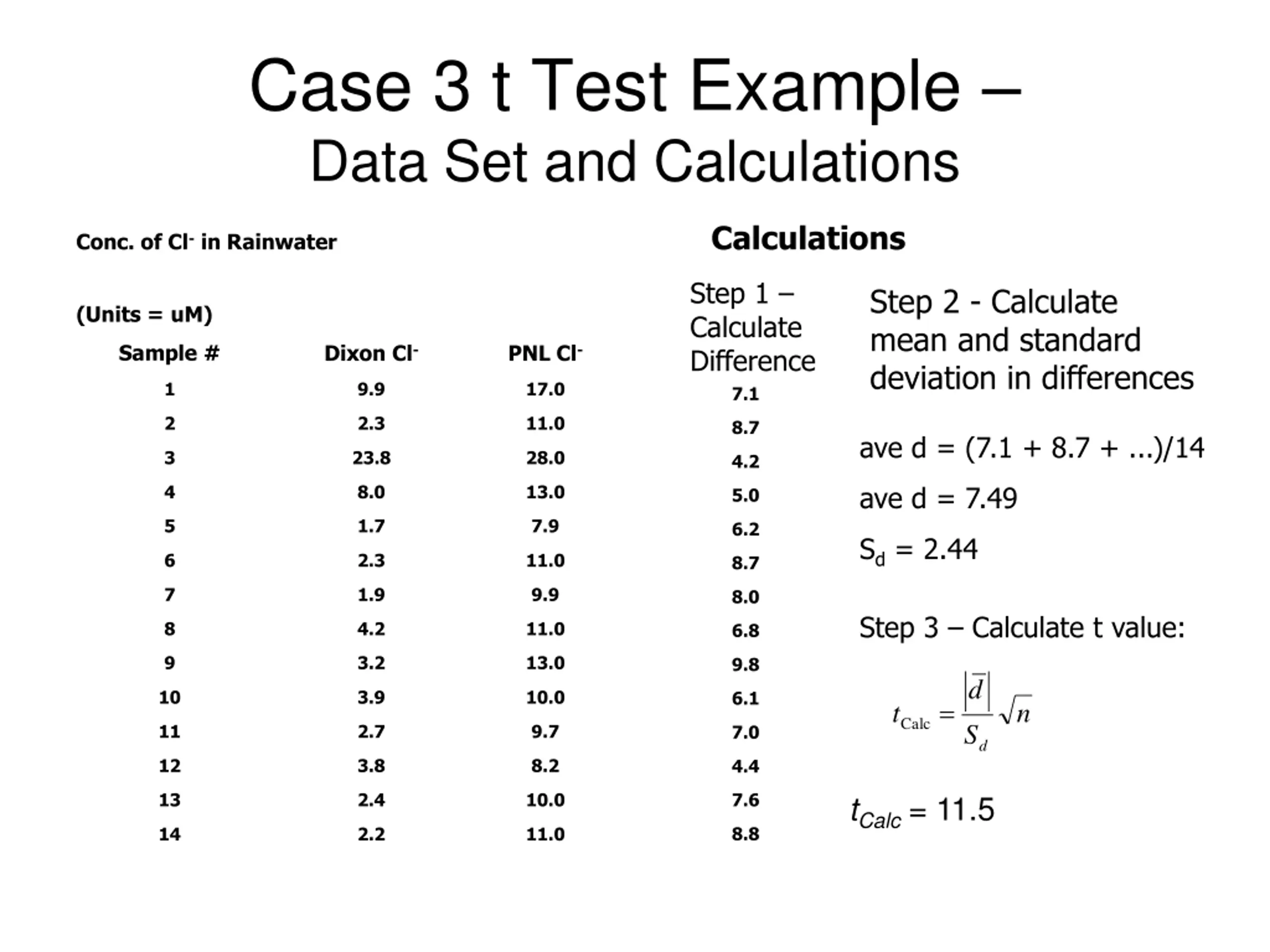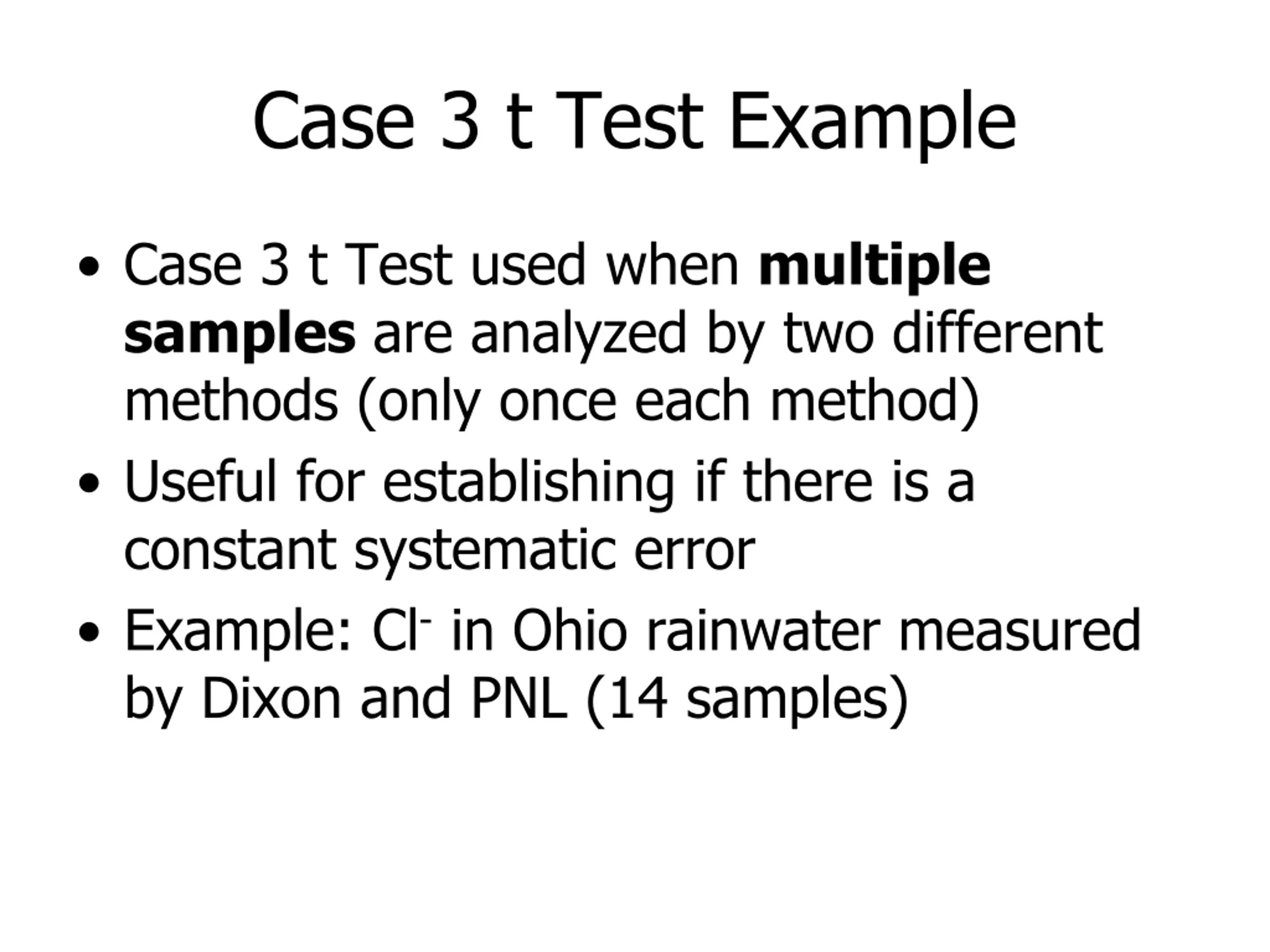 Case 3 t Test Example Case 3 t Test used when multiple samples are analyzed by two different methods (only once each method) Useful for establishing if there is a constant systematic error Example: Cl- in Ohio rainwater measured by Dixon and PNL (14 samples)