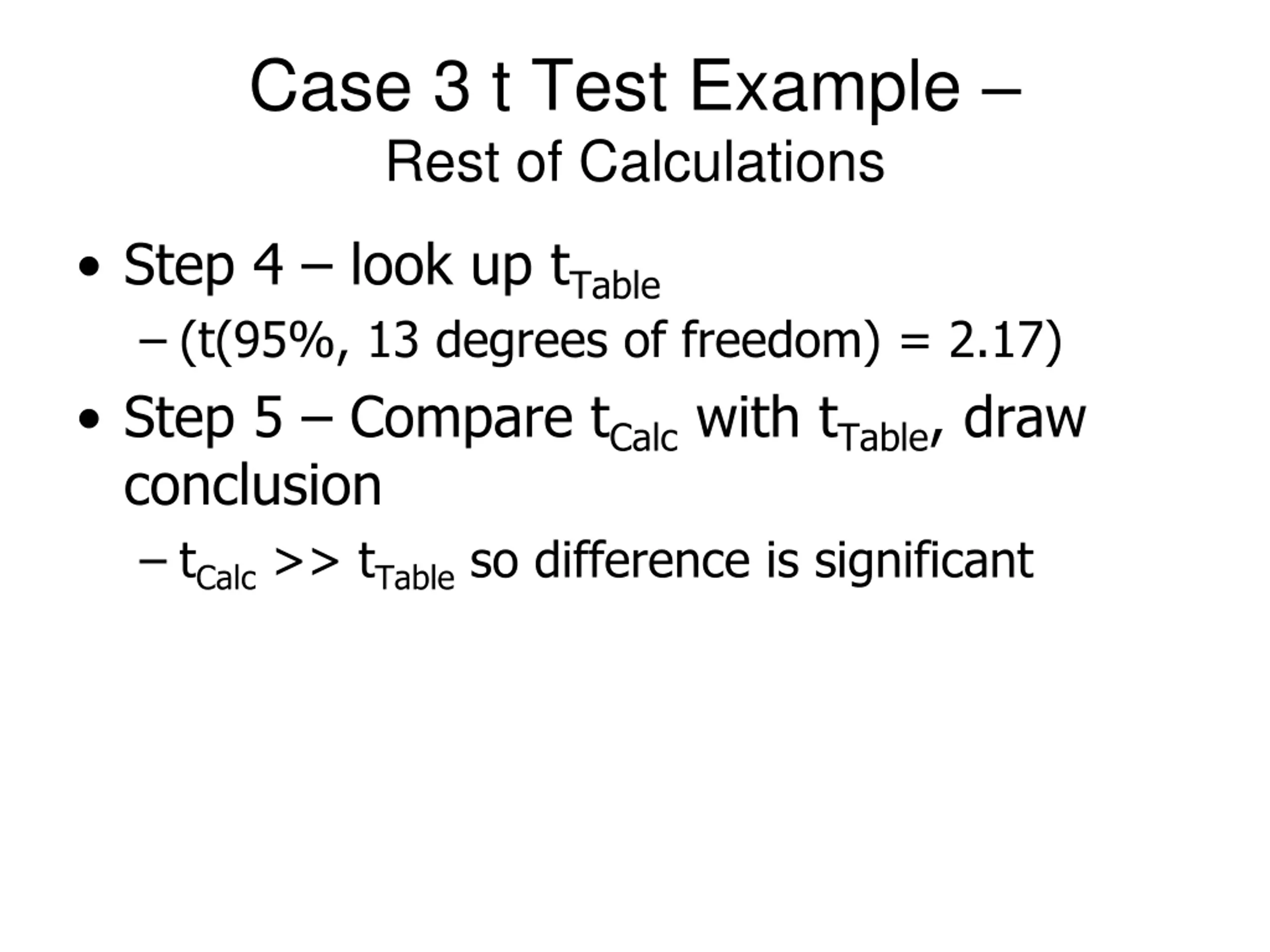 Case 3 t Test Example Rest of Calculations Step 4 look up tTable (t(95%, 13 degrees of freedom) = 2.17) Step 5 Compare tCalc with tTable, draw conclusion tCalc >> tTable so difference is significant