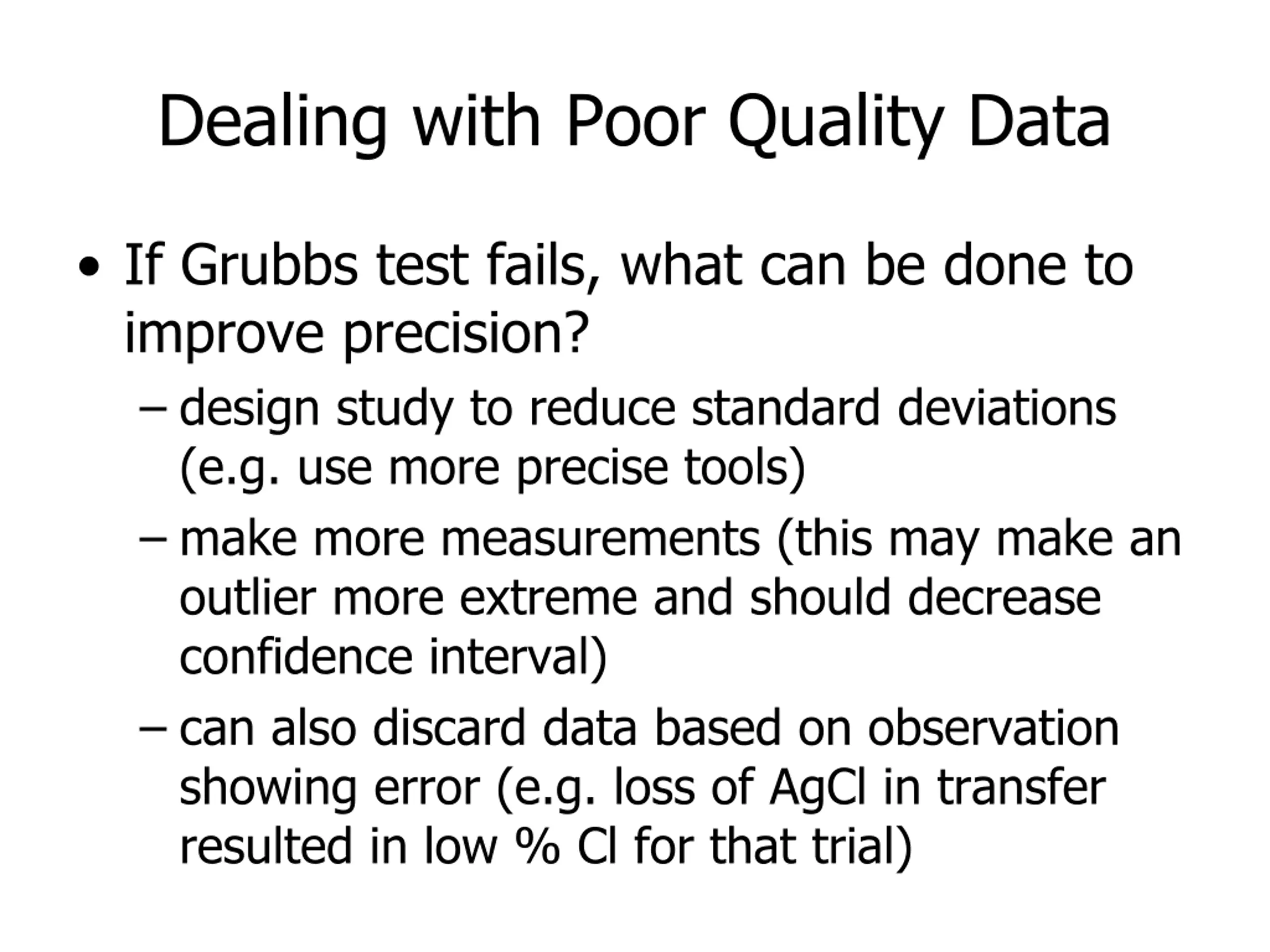 Dealing with Poor Quality Data If Grubbs test fails, what can be done to improve precision? design study to reduce standard deviations (e.g. use more precise tools) make more measurements (this may make an outlier more extreme and should decrease confidence interval) can also discard data based on observation showing error (e.g. loss of AgCl in transfer resulted in low % Cl for that trial)