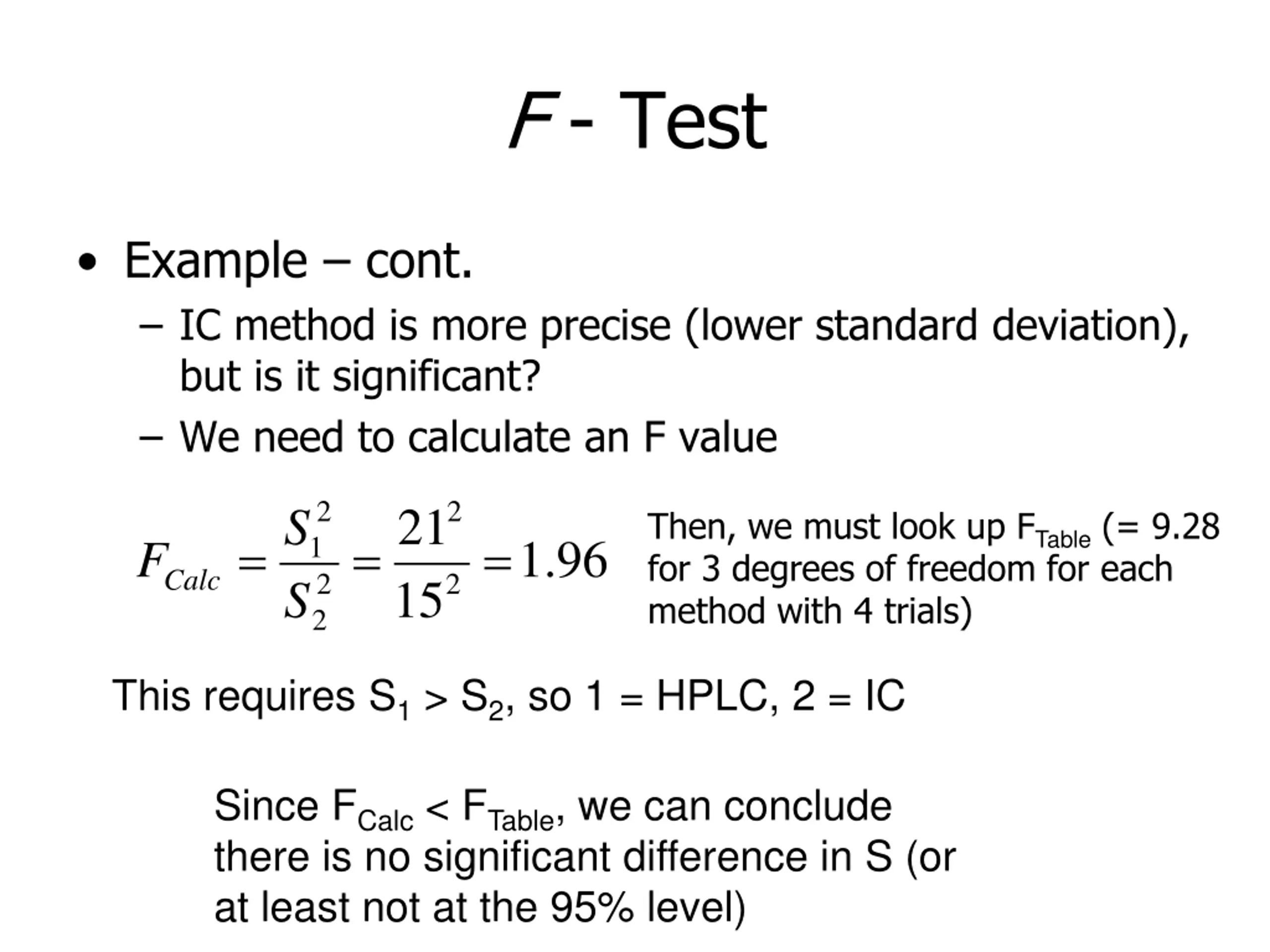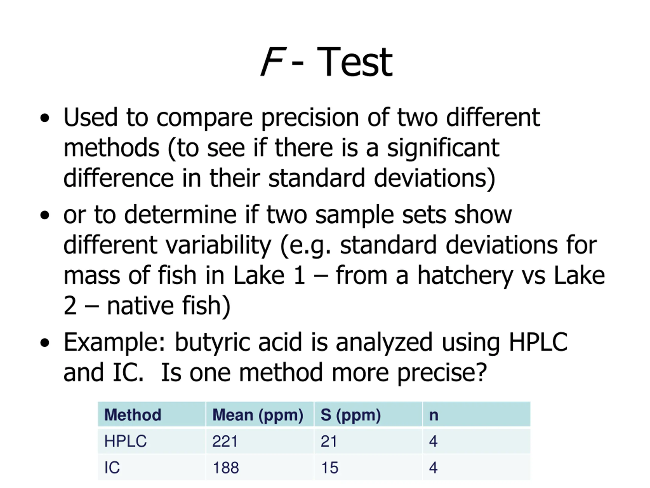 F - Test Used to compare precision of two different methods (to see if there is a significant difference in their standard deviations) or to determine if two sample sets show different variability (e.g. standard deviations for mass of fish in Lake 1 from a hatchery vs Lake 2 native fish) Example: butyric acid is analyzed using HPLC and IC. Is one method more precise? Method HPLC IC Mean (ppm) 221 188 S (ppm) 21 15 n 4 4