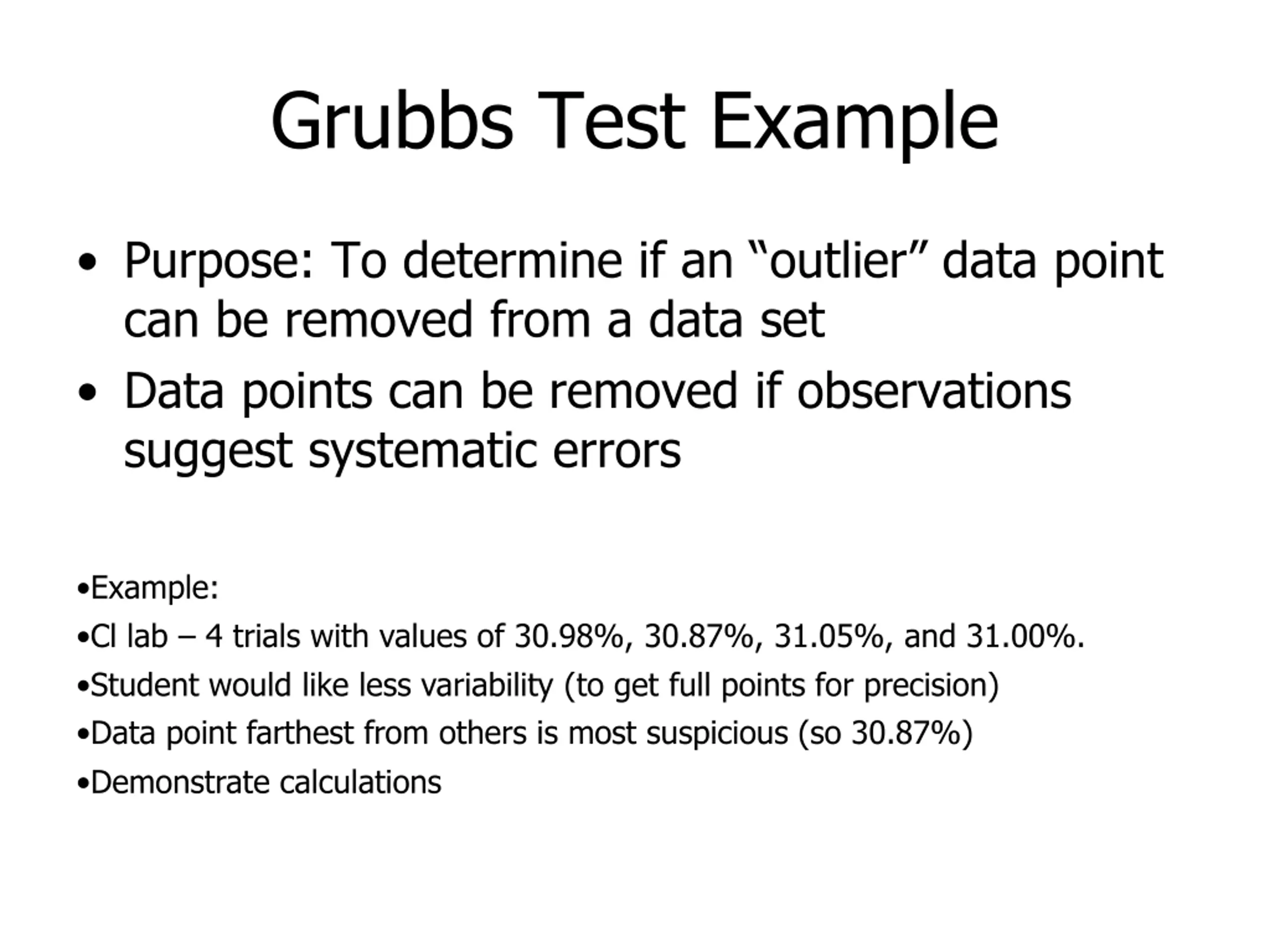 Grubbs Test Example Purpose: To determine if an outlier data point can be removed from a data set Data points can be removed if observations suggest systematic errors Example: Cl lab 4 trials with values of 30.98%, 30.87%, 31.05%, and 31.00%. Student would like less variability (to get full points for precision) Data point farthest from others is most suspicious (so 30.87%) Demonstrate calculations