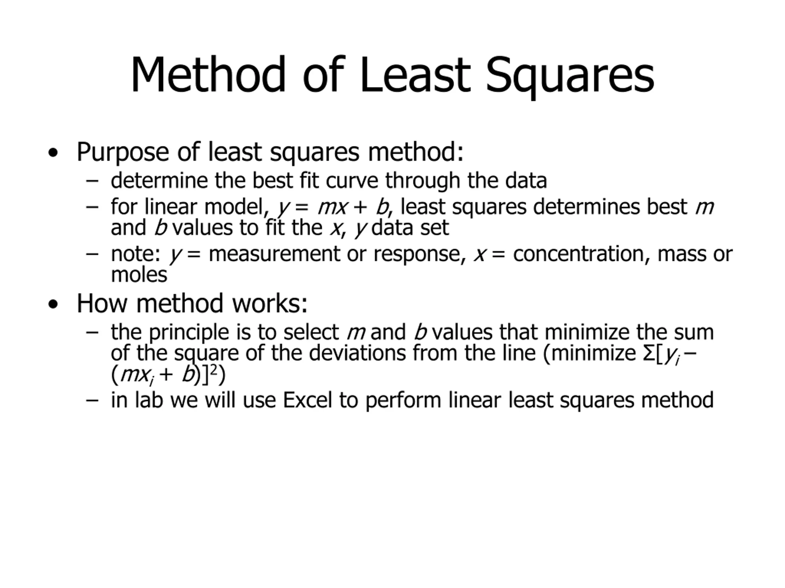 Method of Least Squares Purpose of least squares method: determine the best fit curve through the data for linear model, y = mx + b, least squares determines best m and b values to fit the x, y data set note: y = measurement or response, x = concentration, mass or moles How method works: the principle is to select m and b values that minimize the sum of the square of the deviations from the line (minimize [yi (mxi + b)]2) in lab we will use Excel to perform linear least squares method
