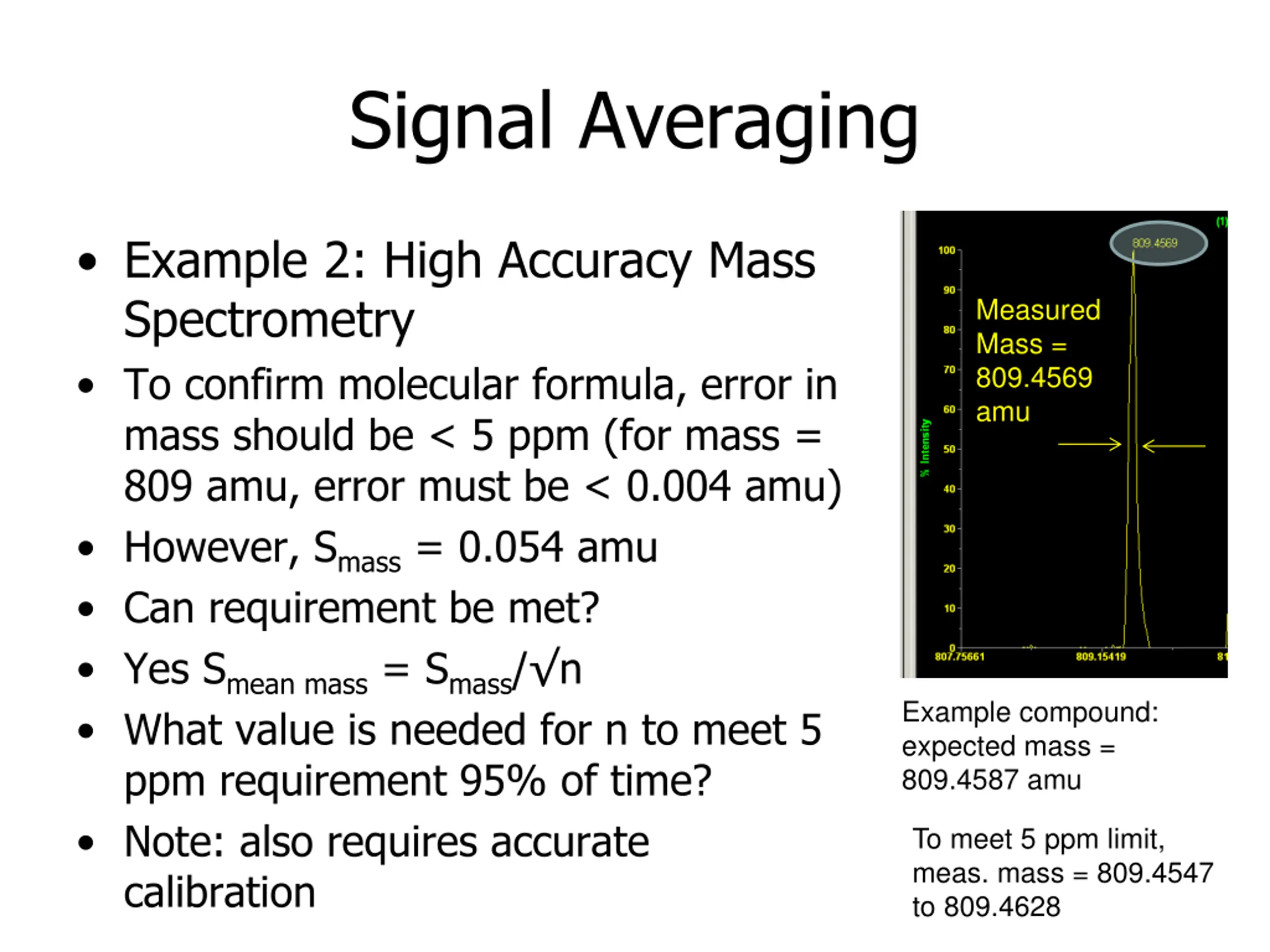 Signal Averaging Example 2: High Accuracy Mass Spectrometry To confirm molecular formula, error in mass should be < 5 ppm (for mass = 809 amu, error must be < 0.004 amu) However, Smass = 0.054 amu Can requirement be met? Yes Smean mass = Smass/ n What value is needed for n to meet 5 ppm requirement 95% of time? Note: also requires accurate calibration Measured Mass = 809.4569 amu Example compound: expected mass = 809.4587 amu To meet 5 ppm limit, meas. mass = 809.4547 to 809.4628