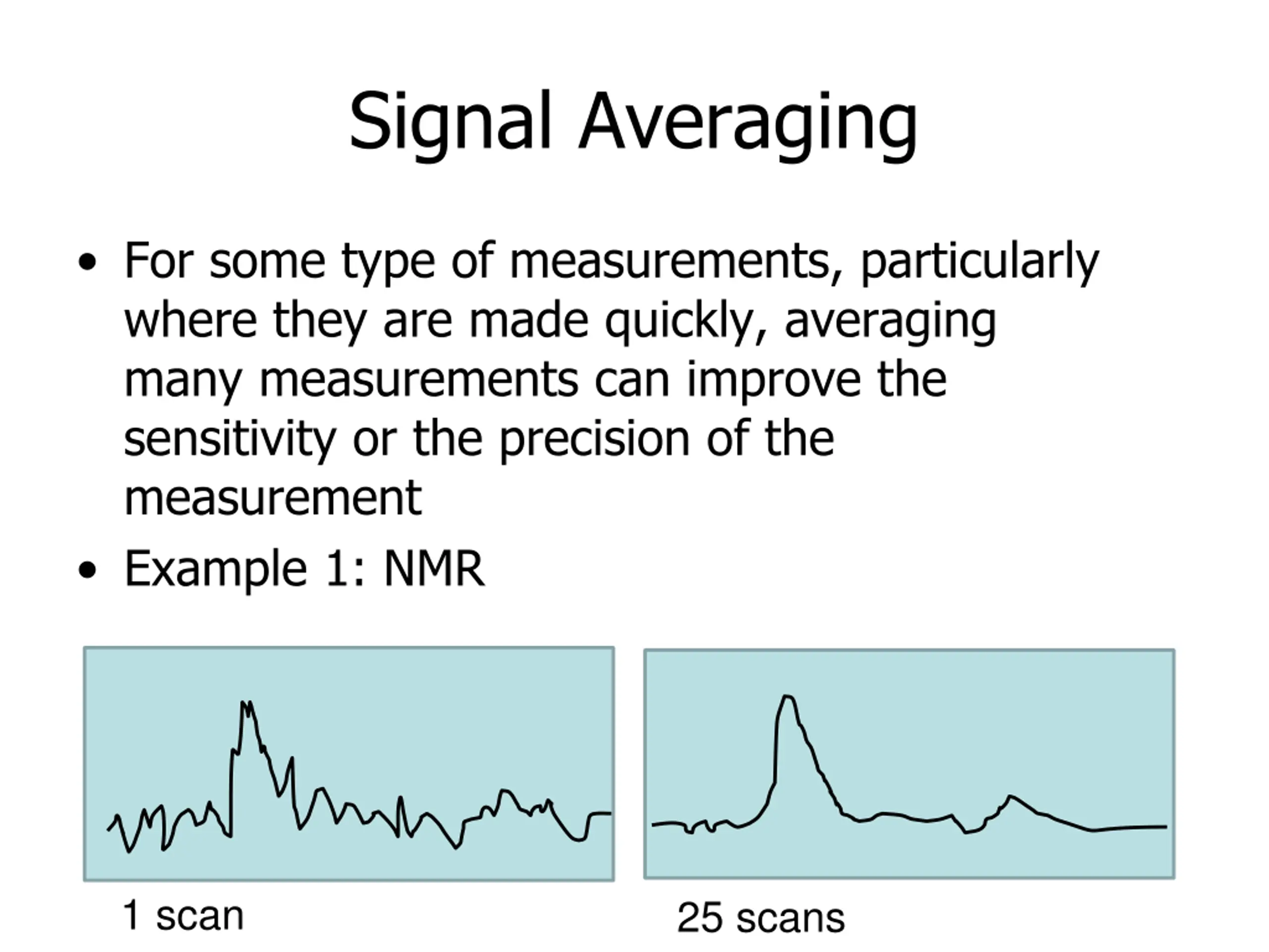 Signal Averaging For some type of measurements, particularly where they are made quickly, averaging many measurements can improve the sensitivity or the precision of the measurement Example 1: NMR 1 scan 25 scans