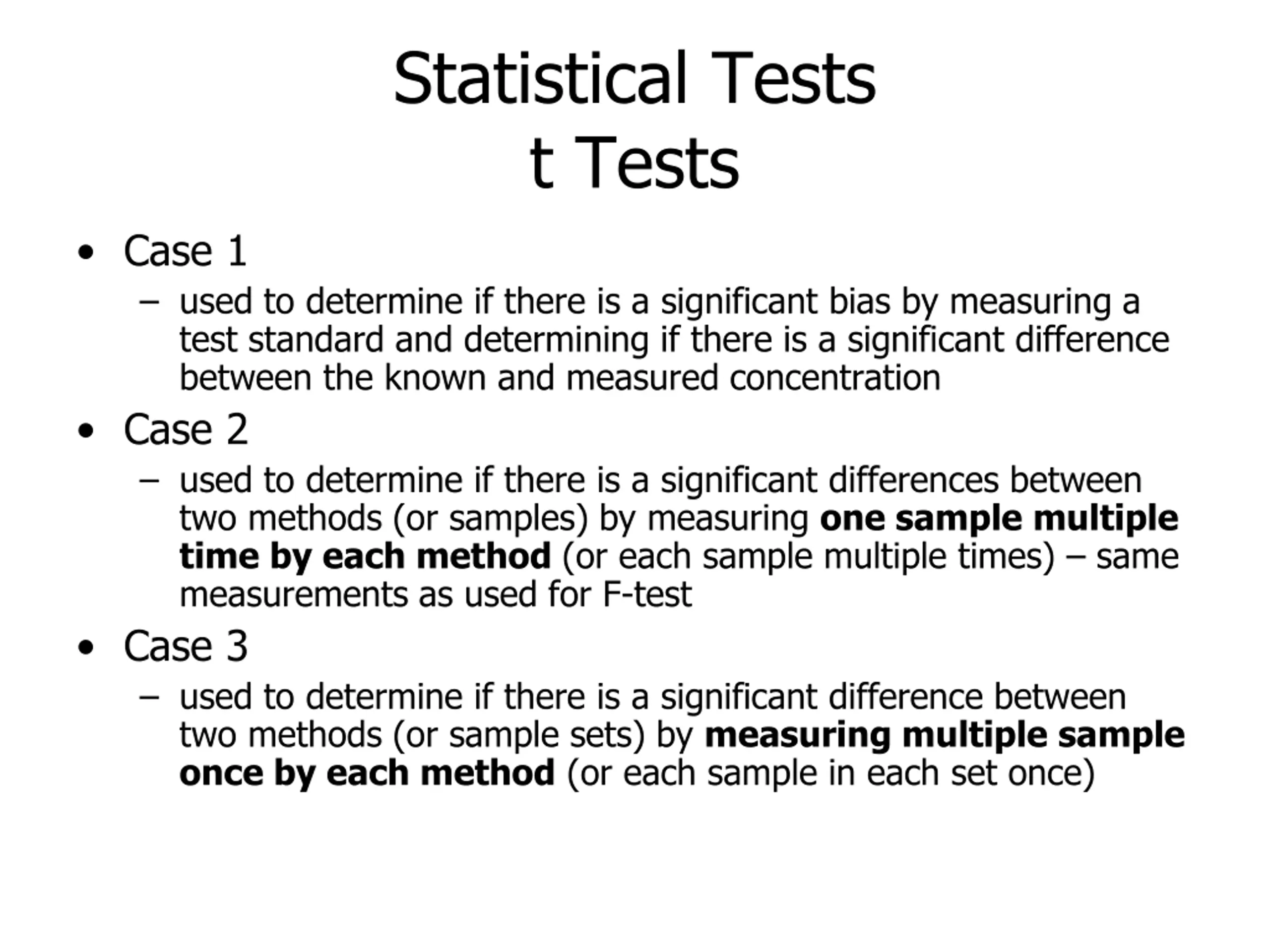 Statistical Tests t Tests Case 1 used to determine if there is a significant bias by measuring a test standard and determining if there is a significant difference between the known and measured concentration Case 2 used to determine if there is a significant differences between two methods (or samples) by measuring one sample multiple time by each method (or each sample multiple times) same measurements as used for F-test Case 3 used to determine if there is a significant difference between two methods (or sample sets) by measuring multiple sample once by each method (or each sample in each set once)