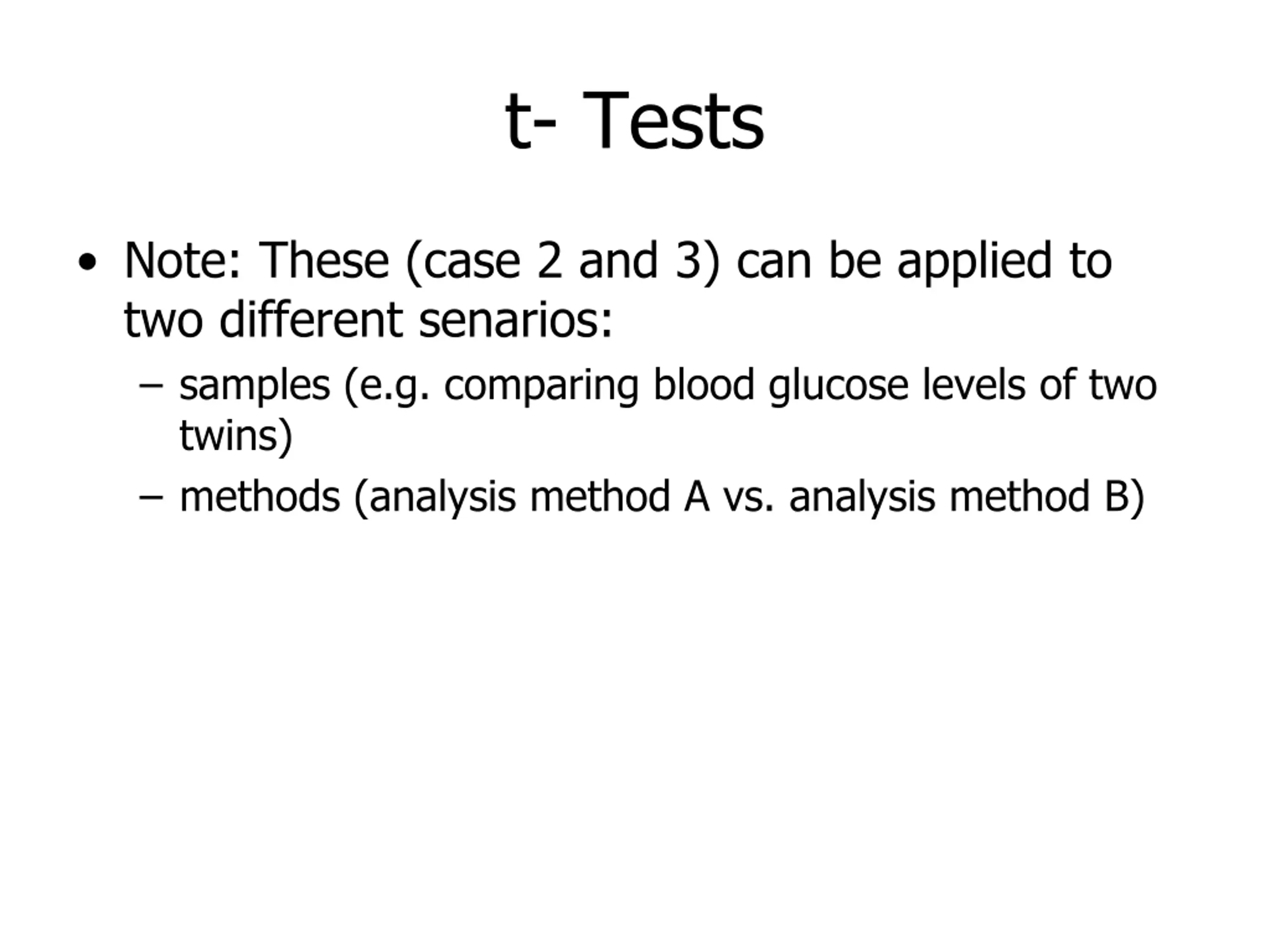 t- Tests Note: These (case 2 and 3) can be applied to two different senarios: samples (e.g. comparing blood glucose levels of two twins) methods (analysis method A vs. analysis method B)