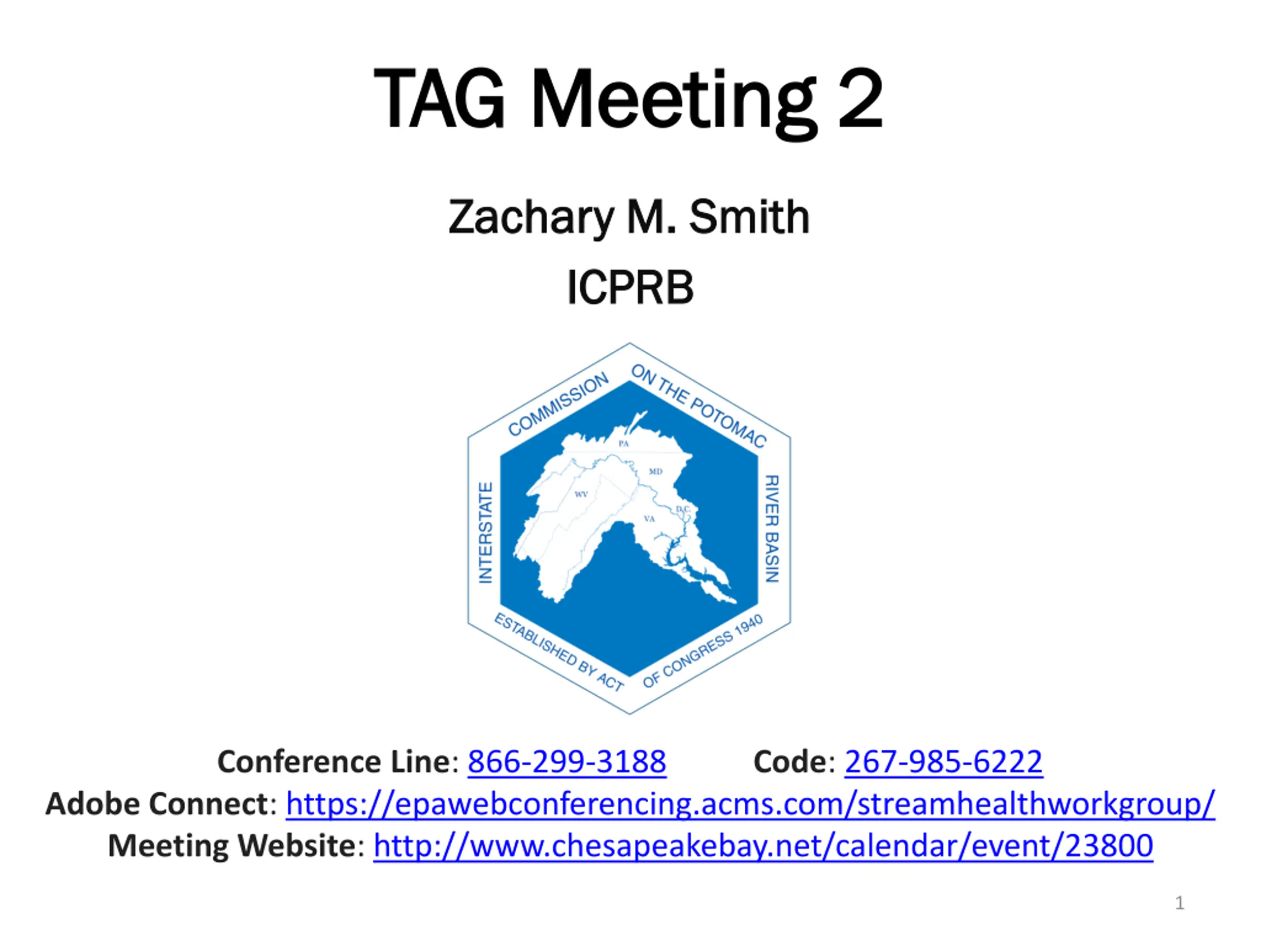 TAG Meeting 2 TAG Meeting 2 Zachary M. Smith Zachary M. Smith ICPRB ICPRB Conference Line: 866-299-3188 Adobe Connect: https://epawebconferencing.acms.com/streamhealthworkgroup/ Meeting Website: http://www.chesapeakebay.net/calendar/event/23800 Code: 267-985-6222 1