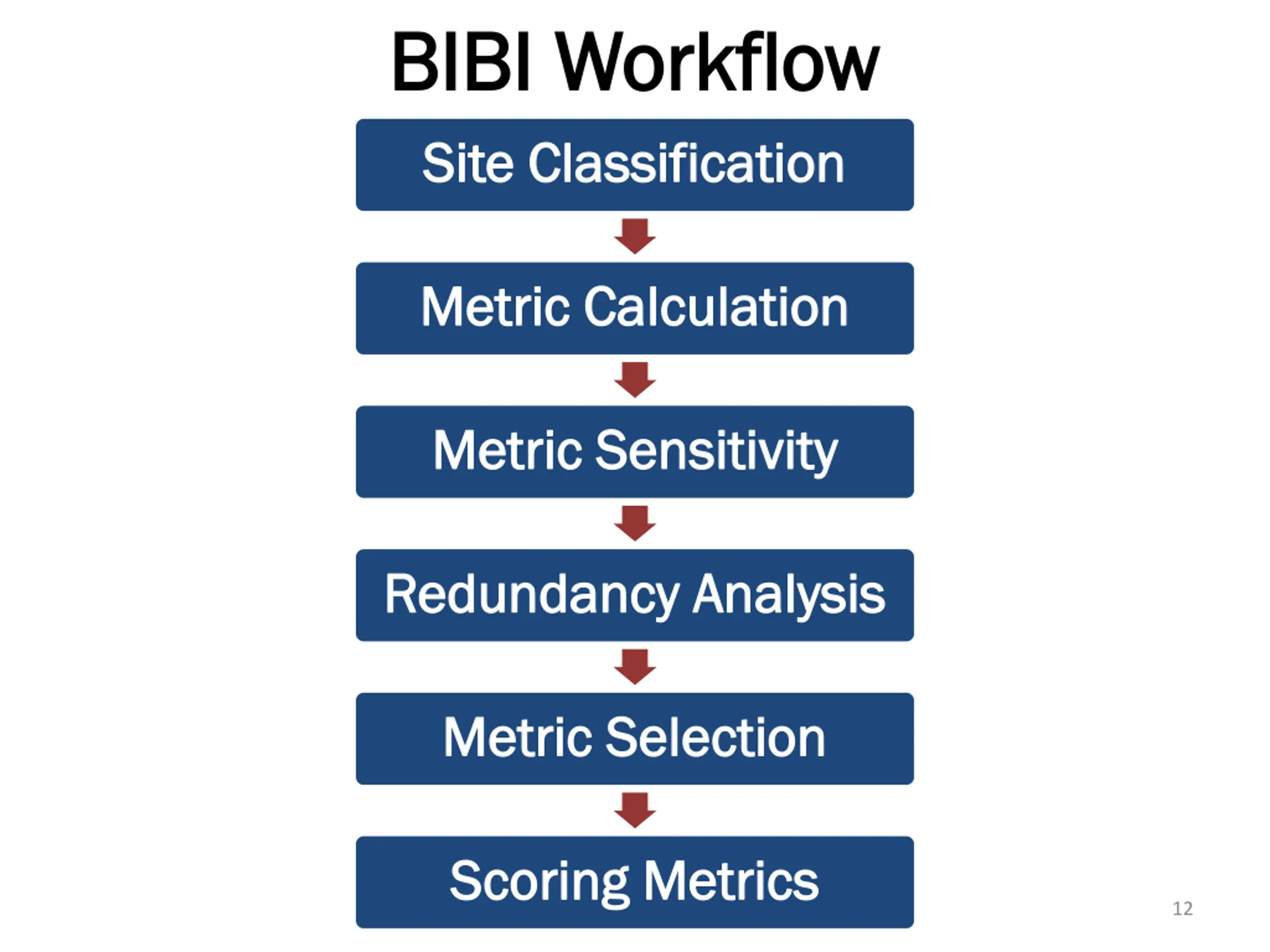 BIBI Workflow BIBI Workflow Site Classification Site Classification Metric Calculation Metric Calculation Metric Sensitivity Metric Sensitivity Redundancy Analysis Redundancy Analysis Metric Selection Metric Selection Scoring Metrics Scoring Metrics 12