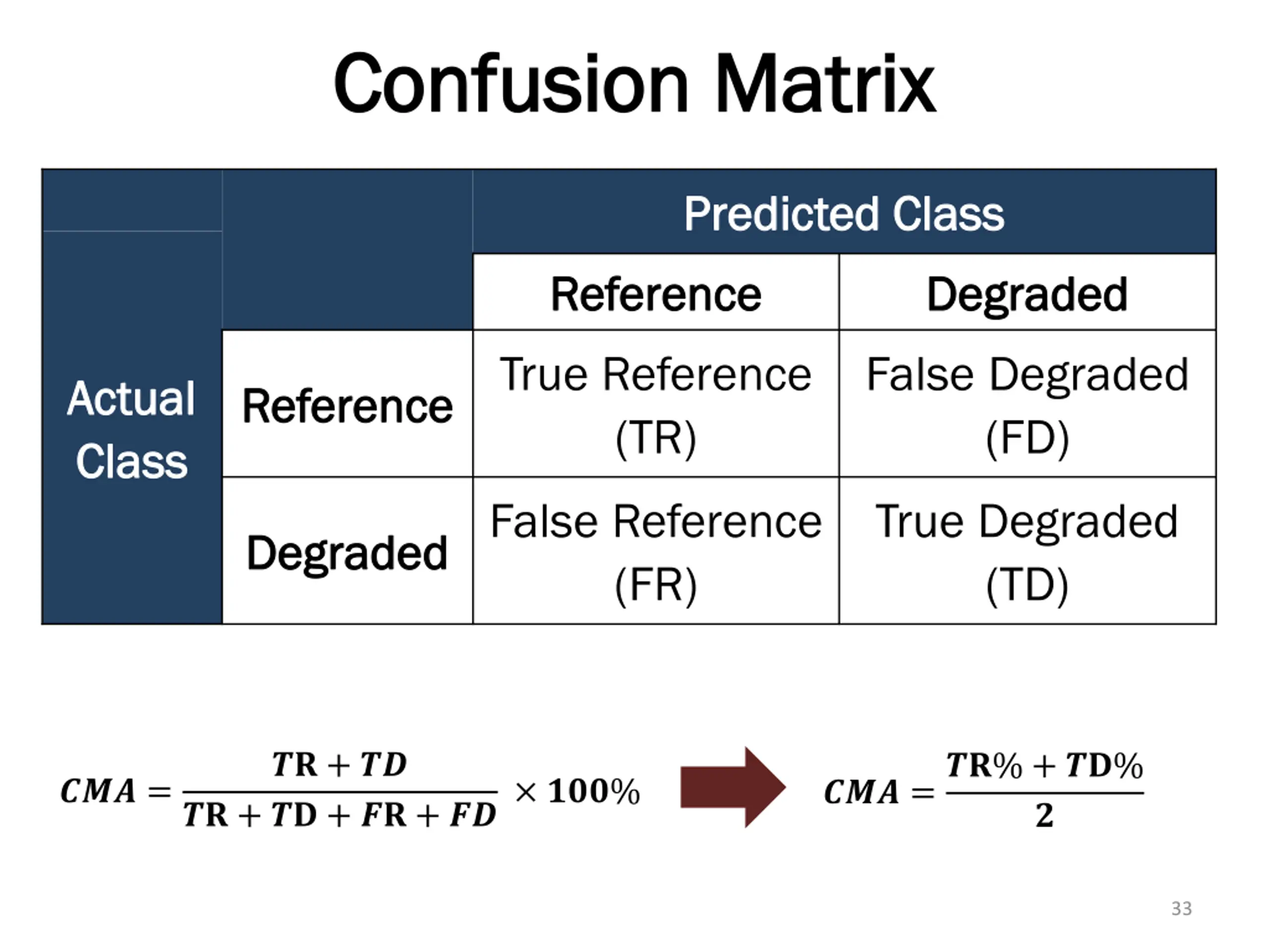 Confusion Matrix Confusion Matrix Predicted Class Predicted Class Reference Reference True Reference (TR) Degraded Degraded False Degraded (FD) Actual Actual Class Class Reference Reference False Reference (FR) True Degraded (TD) Degraded Degraded ?? + ?? ??? =??% + ??% ??? = ?? + ?? + ?? + ?? ???% ? 33