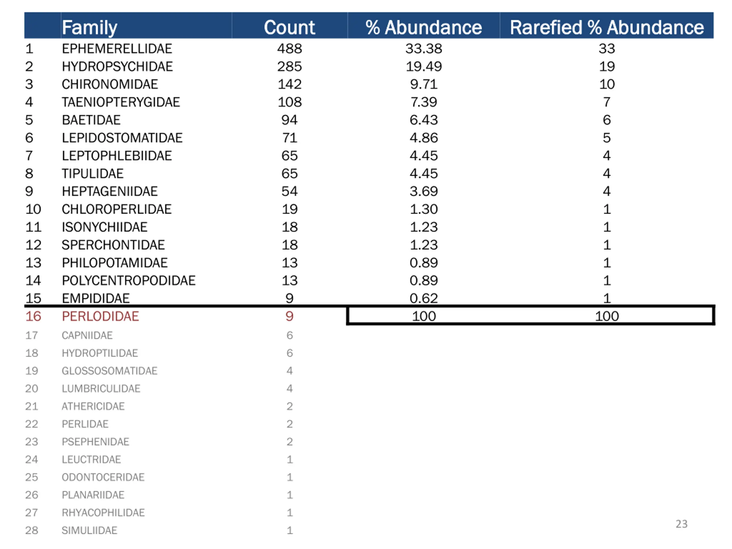 Family Family EPHEMERELLIDAE HYDROPSYCHIDAE CHIRONOMIDAE TAENIOPTERYGIDAE BAETIDAE LEPIDOSTOMATIDAE LEPTOPHLEBIIDAE TIPULIDAE HEPTAGENIIDAE CHLOROPERLIDAE ISONYCHIIDAE SPERCHONTIDAE PHILOPOTAMIDAE POLYCENTROPODIDAE EMPIDIDAE PERLODIDAE CAPNIIDAE HYDROPTILIDAE GLOSSOSOMATIDAE LUMBRICULIDAE ATHERICIDAE PERLIDAE PSEPHENIDAE LEUCTRIDAE ODONTOCERIDAE PLANARIIDAE RHYACOPHILIDAE SIMULIIDAE Count Count 488 285 142 108 94 71 65 65 54 19 18 18 13 13 9 9 6 6 4 4 2 2 2 1 1 1 1 1 % Abundance % Abundance 33.38 19.49 9.71 7.39 6.43 4.86 4.45 4.45 3.69 1.30 1.23 1.23 0.89 0.89 0.62 100 Rarefied % Abundance Rarefied % Abundance 33 19 10 7 6 5 4 4 4 1 1 1 1 1 1 100 1 2 3 4 5 6 7 8 9 10 11 12 13 14 15 16 17 18 19 20 21 22 23 24 25 26 27 28 23