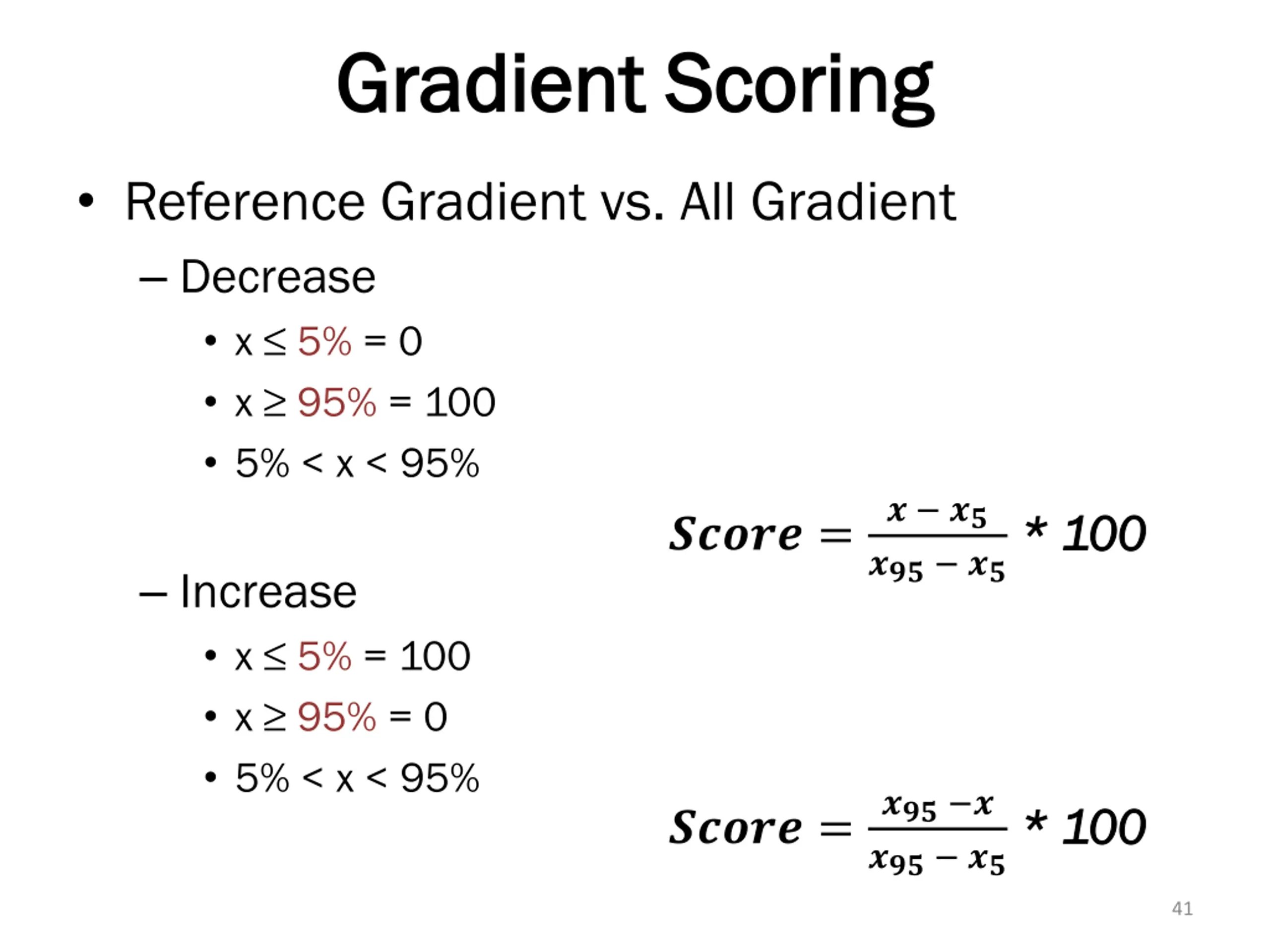 Gradient Scoring Gradient Scoring Reference Gradient vs. All Gradient Decrease x 5% = 0 x 95% = 100 5% < x < 95% ? ?? ??? ?? * 100 * 100 ????? = Increase x 5% = 100 x 95% = 0 5% < x < 95% ??? ? ??? ?? * 100 * 100 ????? = 41