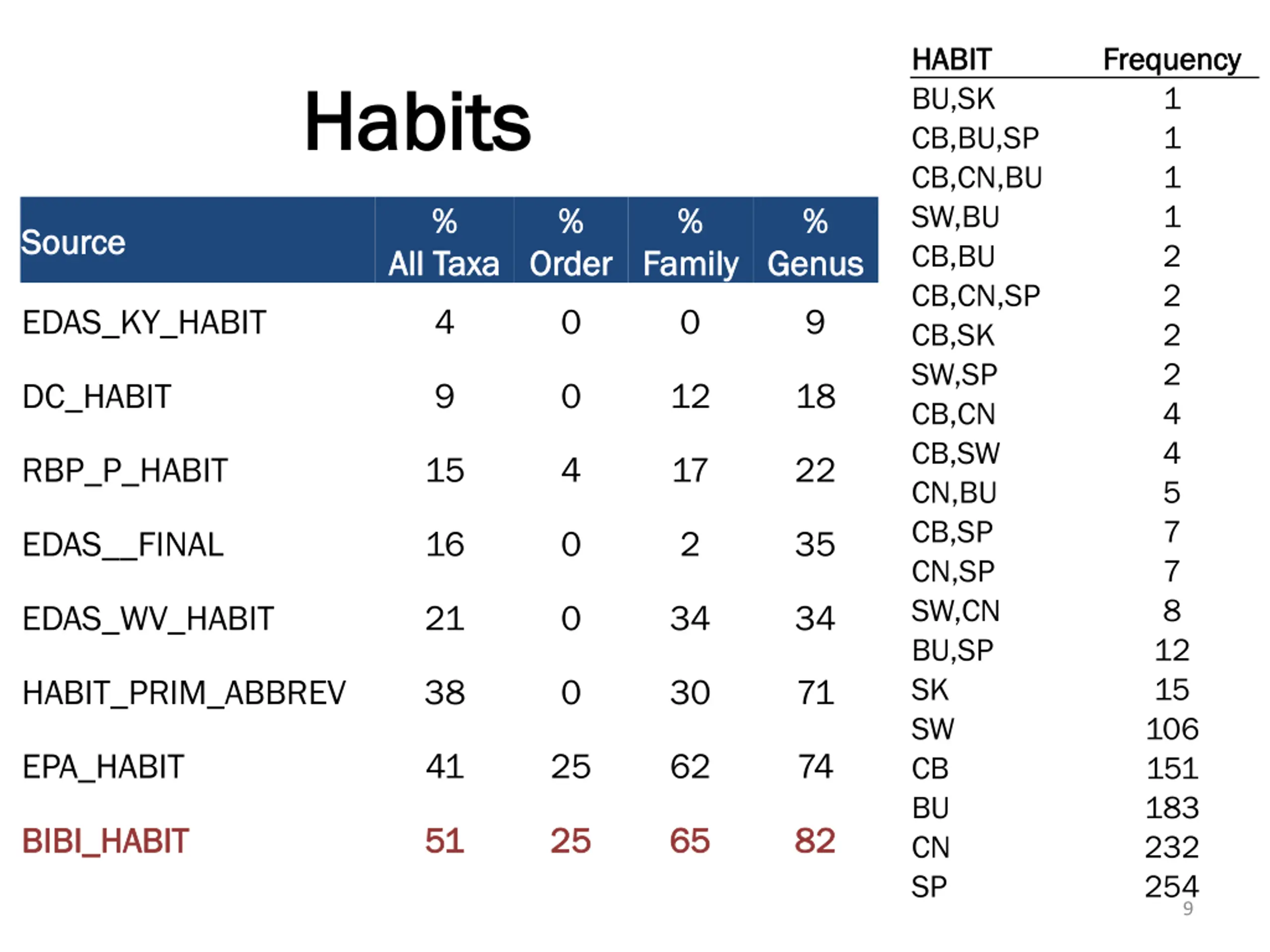 HABIT HABIT BU,SK CB,BU,SP CB,CN,BU SW,BU CB,BU CB,CN,SP CB,SK SW,SP CB,CN CB,SW CN,BU CB,SP CN,SP SW,CN BU,SP SK SW CB BU CN SP Frequency Frequency 1 1 1 1 2 2 2 2 4 4 5 7 7 8 12 15 106 151 183 232 254 Habits Habits % % Taxa % % % % % % Source Source All All Taxa Order Order Family Family Genus Genus EDAS_KY_HABIT 4 0 0 9 DC_HABIT 9 0 12 18 RBP_P_HABIT 15 4 17 22 EDAS__FINAL 16 0 2 35 EDAS_WV_HABIT 21 0 34 34 HABIT_PRIM_ABBREV 38 0 30 71 EPA_HABIT 41 25 62 74 BIBI_HABIT BIBI_HABIT 51 51 25 25 65 65 82 82 9