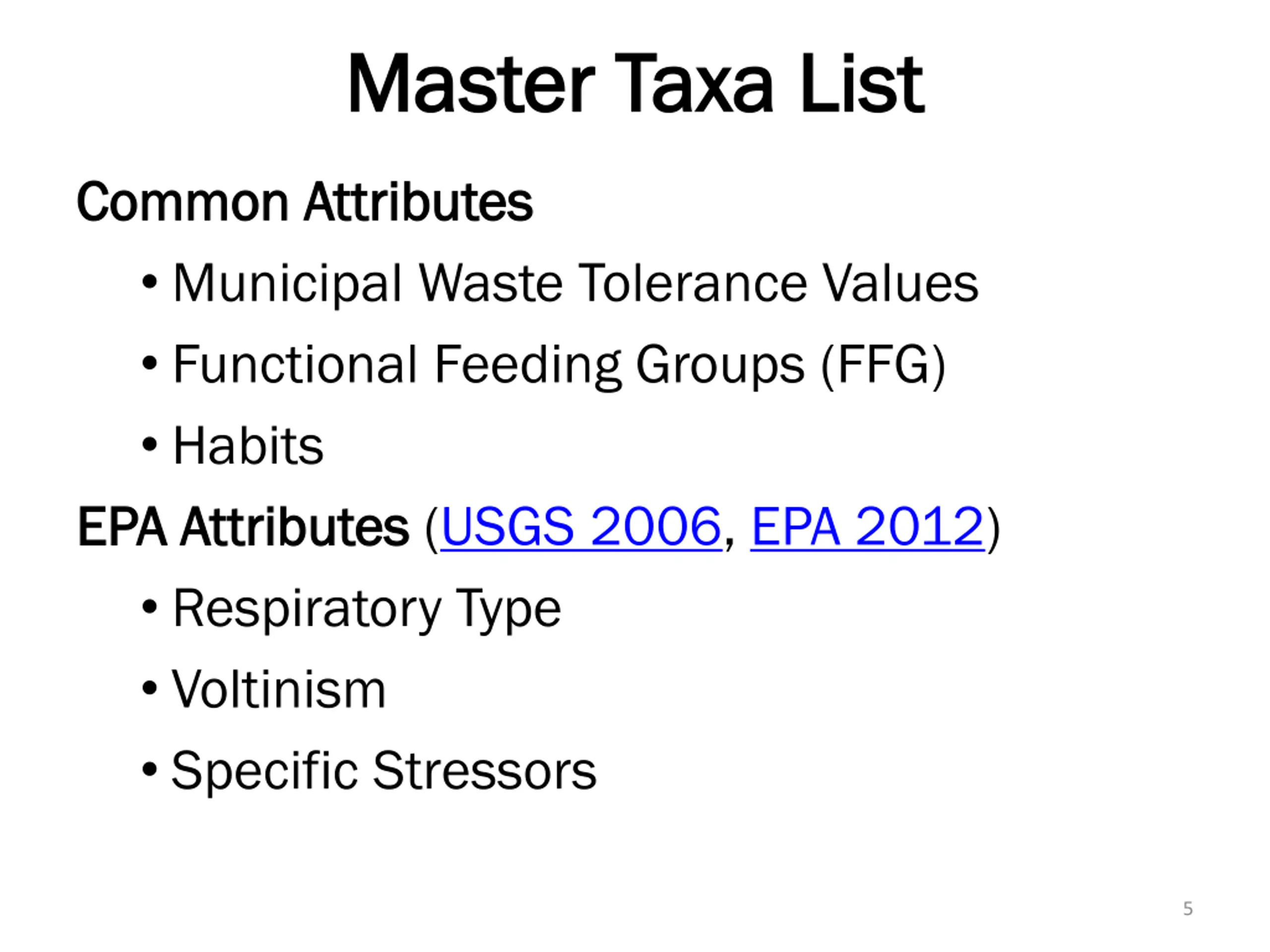 Master Taxa List Master Taxa List Common Attributes Common Attributes Municipal Waste Tolerance Values Functional Feeding Groups (FFG) Habits EPA Attributes EPA Attributes (USGS 2006, EPA 2012) Respiratory Type Voltinism Specific Stressors 5