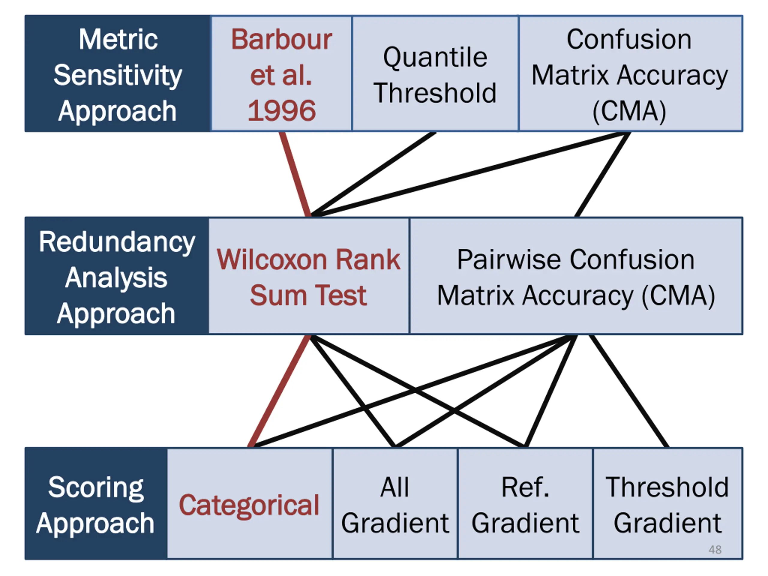 Metric Metric Sensitivity Sensitivity Approach Approach Barbour et al. 1996 Confusion Matrix Accuracy (CMA) Quantile Threshold Redundancy Redundancy Analysis Analysis Approach Approach Wilcoxon Rank Sum Test Pairwise Confusion Matrix Accuracy (CMA) Scoring Scoring Approach Approach All Ref. Threshold Gradient Categorical Gradient Gradient 47