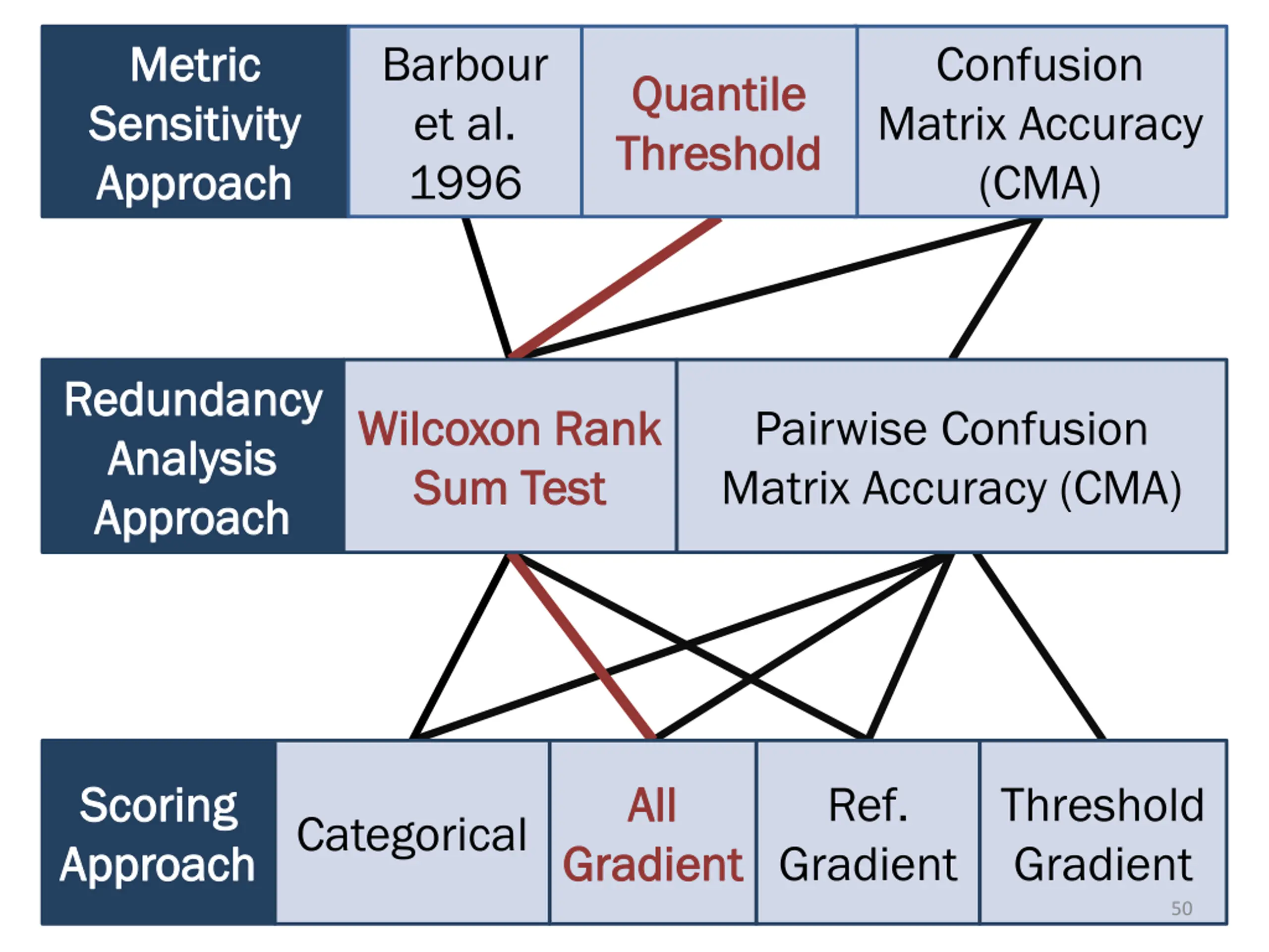 Metric Metric Sensitivity Sensitivity Approach Approach Barbour et al. 1996 Confusion Matrix Accuracy (CMA) Quantile Quantile Threshold Threshold Redundancy Redundancy Analysis Analysis Approach Approach Wilcoxon Rank Wilcoxon Rank Sum Test Sum Test Pairwise Confusion Matrix Accuracy (CMA) Scoring Scoring Approach Approach All All Ref. Threshold Gradient Categorical Gradient Gradient Gradient 50