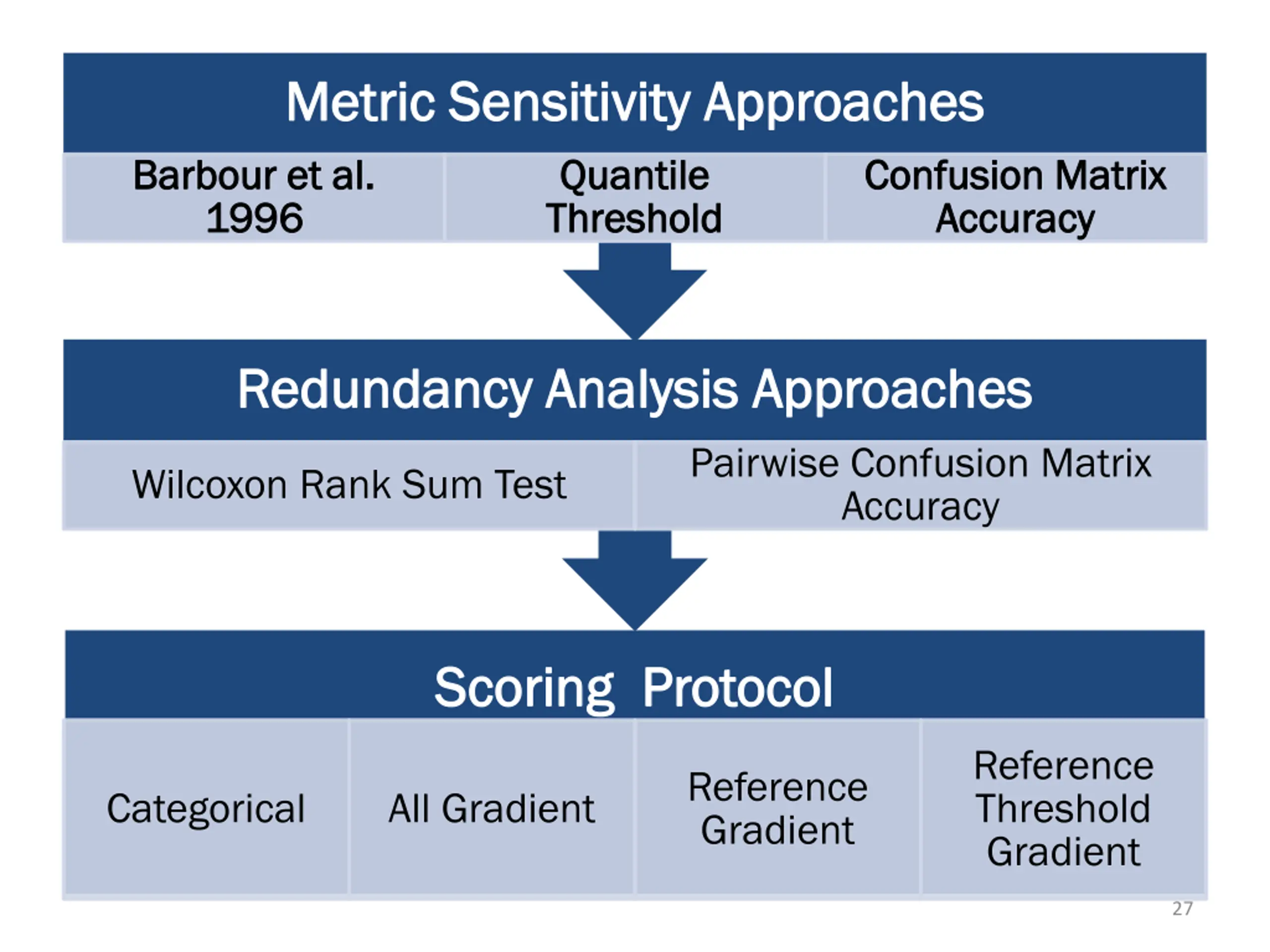 Metric Sensitivity Approaches Metric Sensitivity Approaches Barbour et al. Barbour et al. 1996 1996 Threshold Threshold Quantile Quantile Confusion Matrix Confusion Matrix Accuracy Accuracy Redundancy Analysis Approaches Redundancy Analysis Approaches Pairwise Confusion Matrix Accuracy Wilcoxon Rank Sum Test Scoring Protocol Scoring Protocol Reference Threshold Gradient Reference Gradient Categorical All Gradient 27