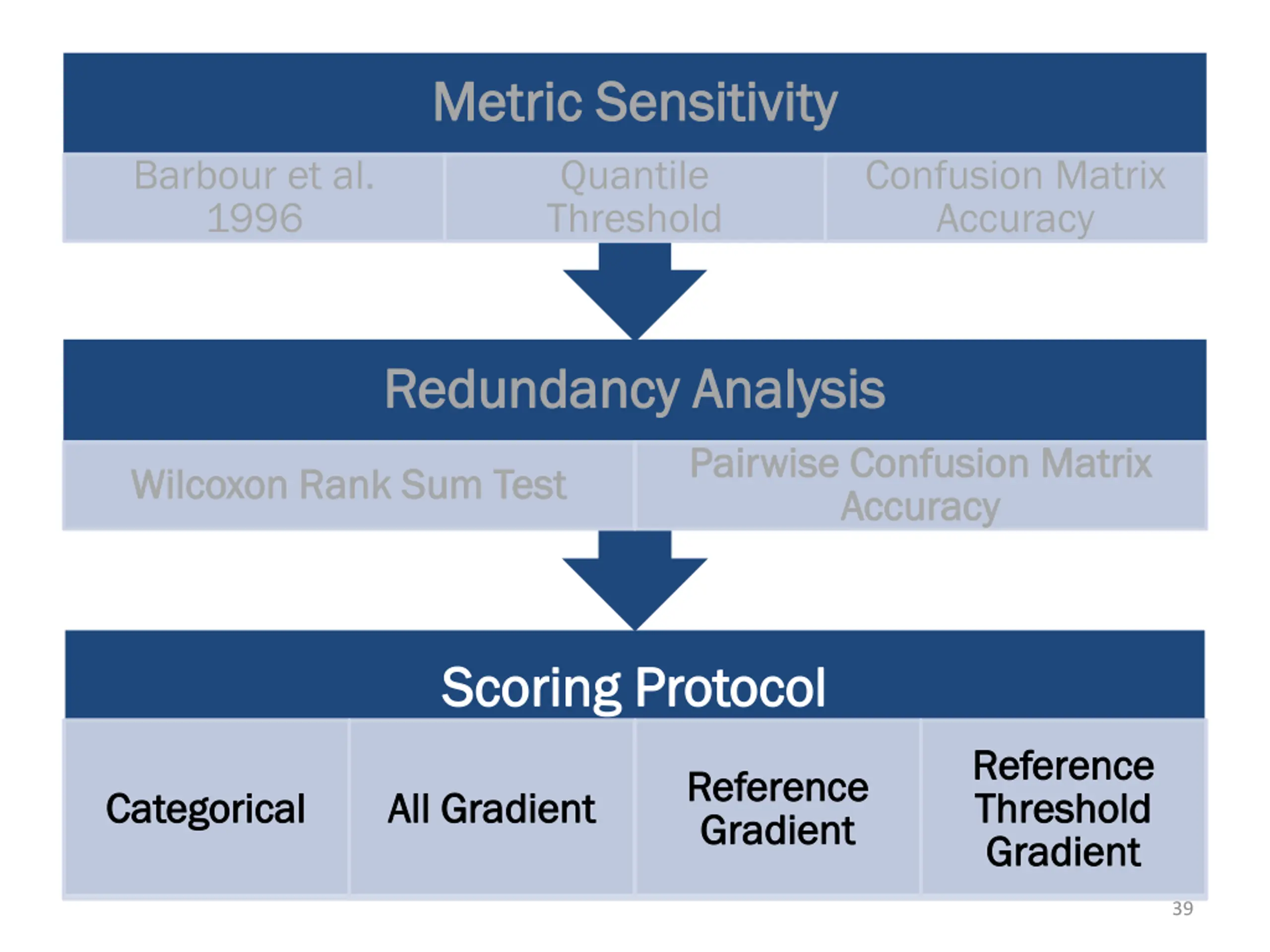 Metric Sensitivity Metric Sensitivity Quantile Threshold Barbour et al. 1996 Confusion Matrix Accuracy Redundancy Analysis Redundancy Analysis Pairwise Confusion Matrix Pairwise Confusion Matrix Accuracy Accuracy Wilcoxon Rank Sum Test Wilcoxon Rank Sum Test Scoring Protocol Scoring Protocol Reference Reference Threshold Threshold Gradient Gradient Reference Reference Gradient Gradient Categorical Categorical All Gradient All Gradient 39