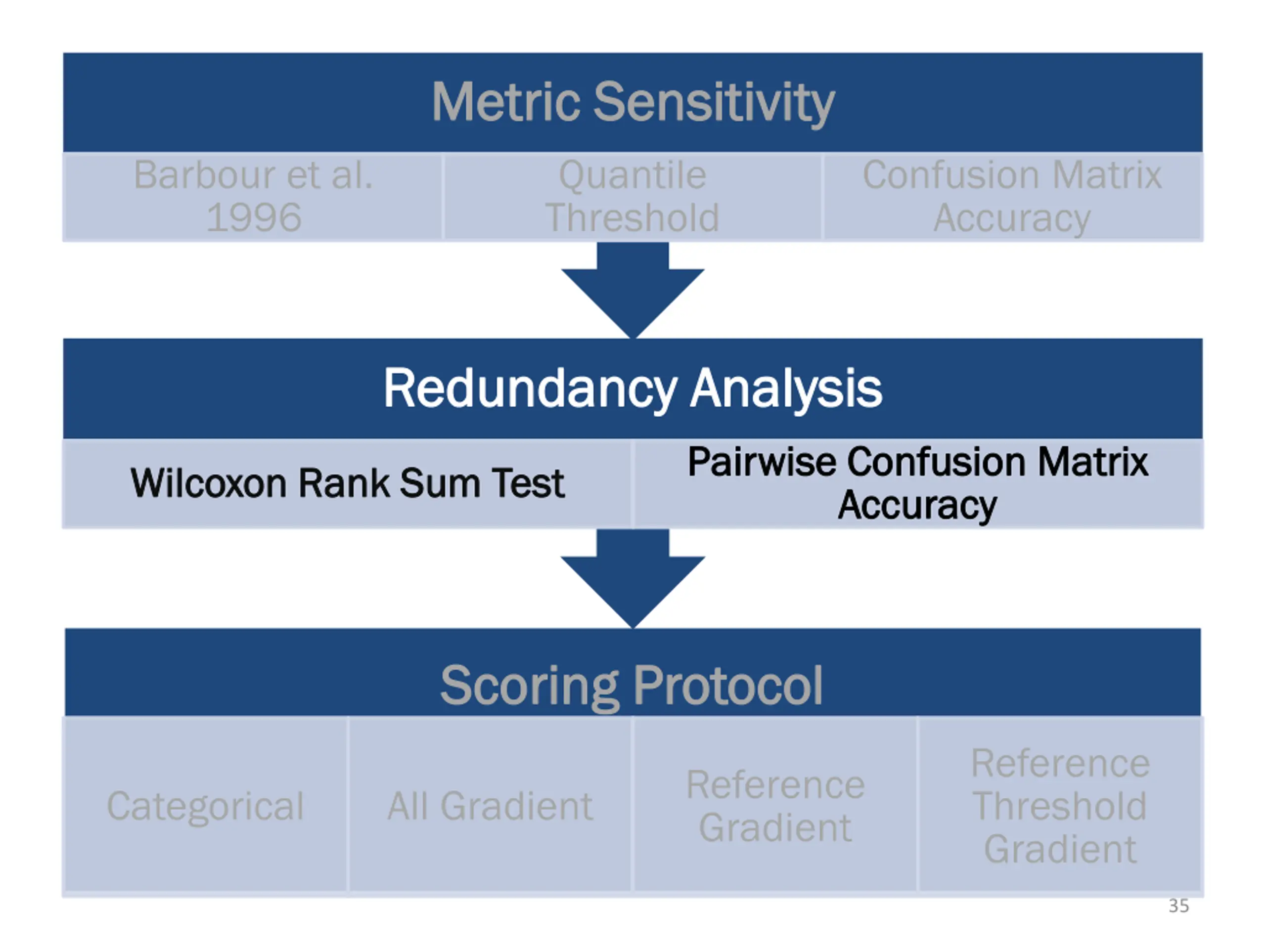 Metric Sensitivity Metric Sensitivity Quantile Threshold Barbour et al. 1996 Confusion Matrix Accuracy Redundancy Analysis Redundancy Analysis Pairwise Confusion Matrix Pairwise Confusion Matrix Accuracy Accuracy Wilcoxon Rank Sum Test Wilcoxon Rank Sum Test Scoring Protocol Scoring Protocol Reference Threshold Gradient Reference Gradient Categorical All Gradient 35