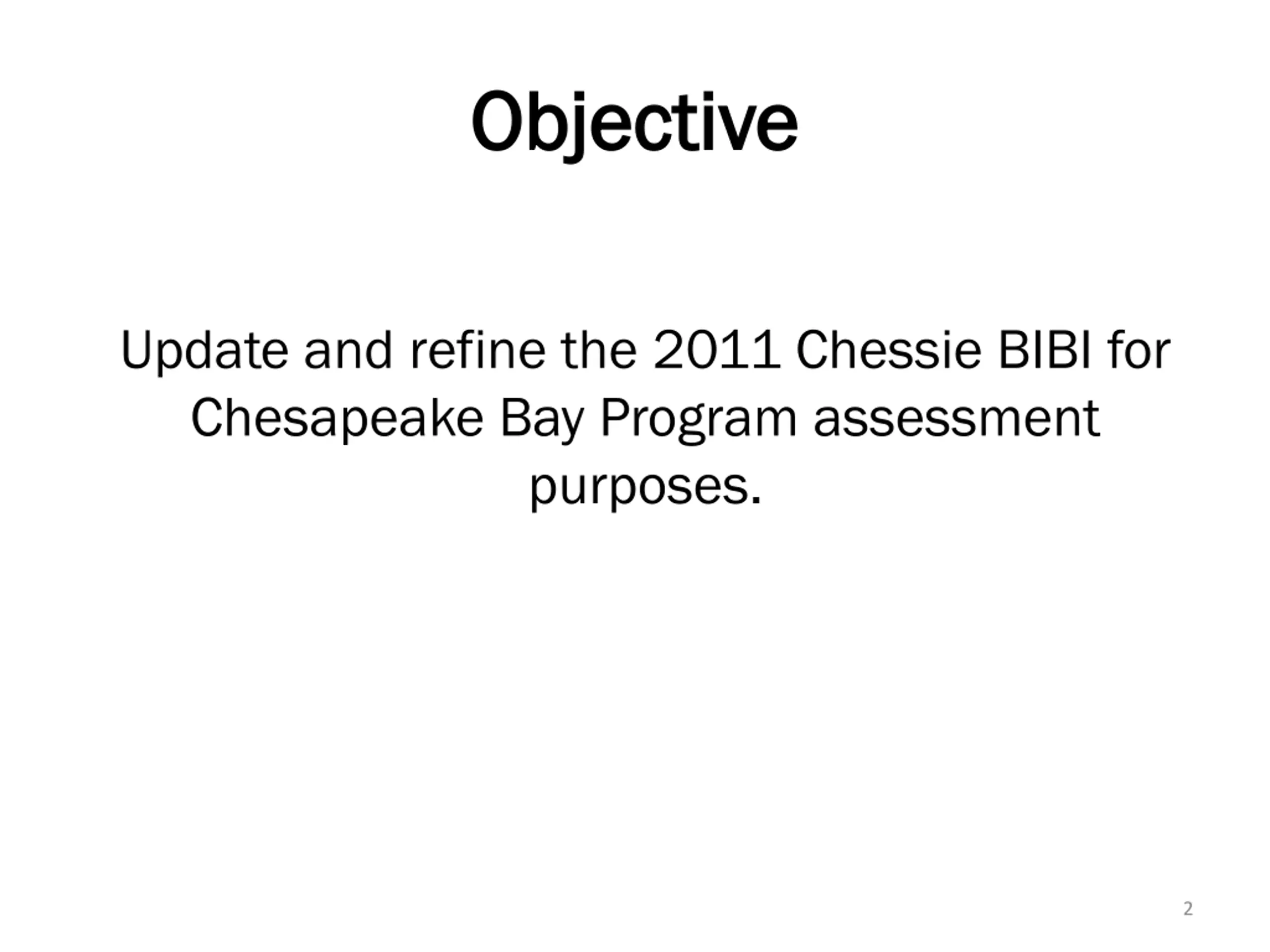 Objective Objective Update and refine the 2011 Chessie BIBI for Chesapeake Bay Program assessment purposes. 2
